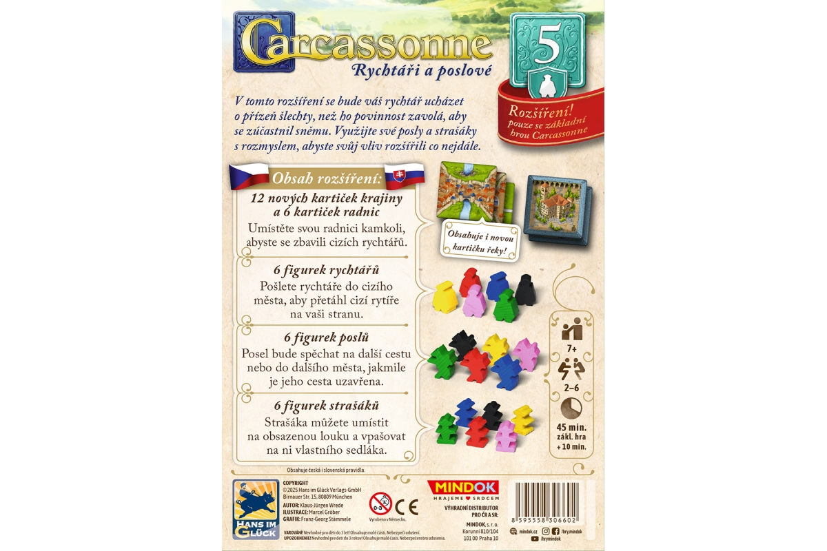 Rychtáři a poslové přináší do hry Carcassonne nové figurky s jedinečnými schopnostmi. Získejte přízeň šlechty s rychtářem, přemísťujte se s poslem a obsaďte lukrativní louky se strašáky. Strategicky umístěná radnice vám pomůže k vítězství, ale může také odvolat rychtáře, a proto si dobře rozmyslete, co uděláte. Určeno pro 2-6 hráčů. Věk 7+