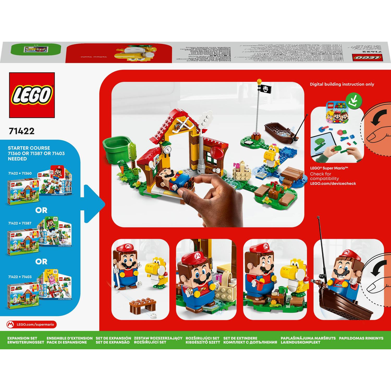 S tímto cool rozšiřujícím setem LEGO® Super Mario™ (71422) Piknik u Maria vytvořit novou zábavnou úroveň. Domek a zahrada z kostek jsou detailně propracované a nabízejí mnoho příležitostí k hraní rolí a způsobů, jak mohou hráči získat digitální mince s interaktivními figurkami LEGO® Maria, LEGO® Luigiho nebo LEGO® Peach™ (nejsou součástí balení). Pozdravte Yellow Yoshiho, vyspěte se na posteli, „pochutnejte si“ na sušenkách z piknikového koše, „zalijte“ zeleninu na zahradě, hrajte hokej nebo vyrazte s loďkou na ryby. Poznámka: Pro interaktivní herní zážitek je zapotřebí některý ze startovacích setů 71360, 71387 nebo 71403.