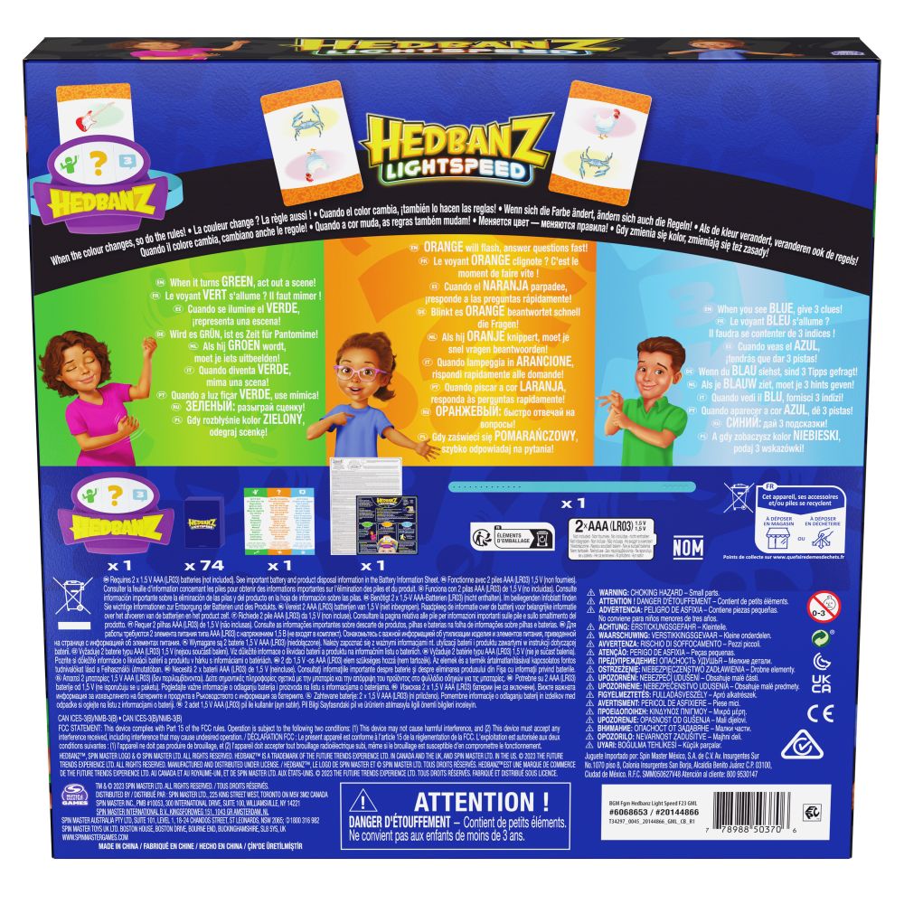 Rychlá hádací hra „Co jsem?“ je zpátky z Hedbanz Lightspeed! Hedbanz od Spin Master Games je zábava pro celou rodinu. Hraje oblíbenou hru s otázkami rychlostí světla! Pravidla se mění bleskově, protože vaše elektronická čelenka přepíná mezi třemi barvami. Uhodněte maximum karet, než z čelenky začne hrát hudba, která znamená, že váš čas vypršel! Hráč, který nasbíral nejvíc bodů, vyhrává! Když svítí ZELENÁ, hrajete scénku! ORANŽOVÁ znamená rychlost světla: odpovídejte co nejrychleji! Když uvidíte MODROU, je čas na tři nápovědy! Tuto jedinečnou elektronickou čelenku si zamilujete. Protože má SVĚTLA a ZVUKY, vyžaduje 2 baterie AAA (nejsou součástí balení). Na kartách jsou vtipné ilustrace, jako třeba kyselá okurka nebo elektrická kytara. Hedbanz je nezbytným doplňkem vaší sbírky deskových her pro děti ve věku 8–12 let, ale pobaví každého od 6 let výš. Je vhodná pro 2–6 hráčů a poslouží vždy, když budete potřebovat hračky pro dívky ve věku 6–8 let, rodinné deskové hry nebo hry pro děti. Hedbanz je společenská aktivita pro celou rodinu, která pobaví všechny generace. Je to klasická hra s hádáním obrázků, která je známá už roky! Ať už hledáte deskové hry pro děti ve věku 6–8 let nebo jakékoliv zábavné hry, tato nová edice Hedbanz vás jednoznačně pobaví – když se změní barva, mění se i pravidla! Připravte se na světla, barvy a akci s Hedbanz Lightspeed! Spin Master přináší dětem zábavu v podobě hraček a her včetně hraček pro batolata, hraček pro dívky a deskových her. Sbírejte své oblíbené plyšáky, antistresové hračky, auta na dálkové ovládání, akční figurky, panenky a příslušenství a mnoho dalšího. V našem katalogu najdete ideální dárek ke každým narozeninám, od speciálních dárků pro děti a batolata až po dárky pro ty, kteří zůstávají mladí duchem. Pokud chcete ještě víc, podívejte se na vzdělávací hračky pro děti, hračky do bazénu, venkovní hry a monster trucky vhodné pro každé roční období. Buďte kreativní s výtvarnými sadami, stavebnicovými hračkami a autíčky na dálkové ovládání nebo skládejte skládačky pro dospělé a hrajte karetní hry. Roztočte to na pískovišti ještě dnes se Spin Masterem!