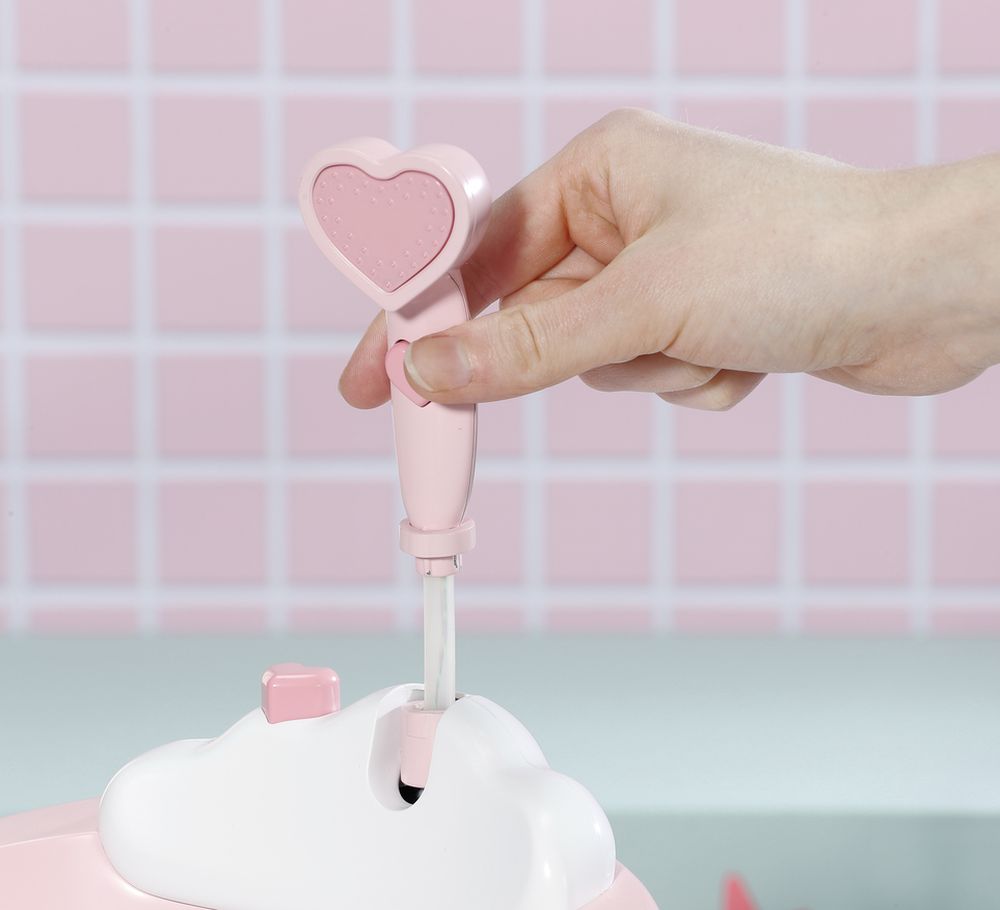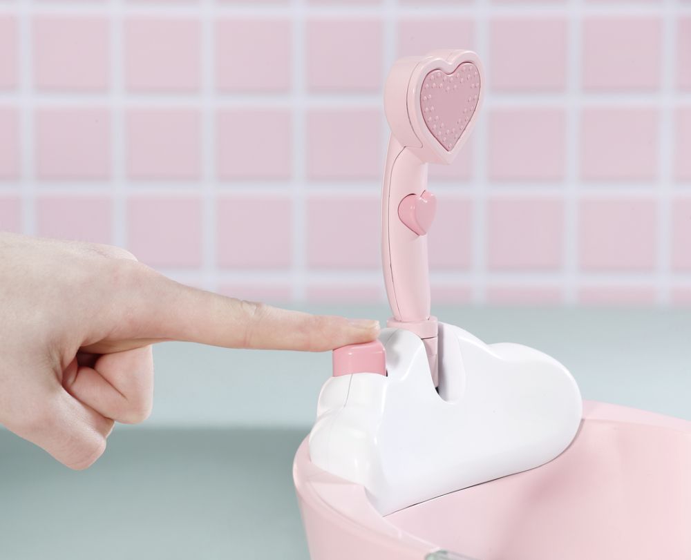Jakmile stisknete tlačítko ve tvaru srdíčka umístěné na sprše, uslyšíte šplouchání vody. Pokud toto tlačítko podržíte stisknuté, rozsvítí se na sprchové hlavici velké srdce a prostřednictvím světelného paprsku vytvoří iluzi proudu vody. Tímto proudem se pak může Baby Annabell hravě osprchovat. Opravdový zážitek z koupání doprovázejí zvuky vody.