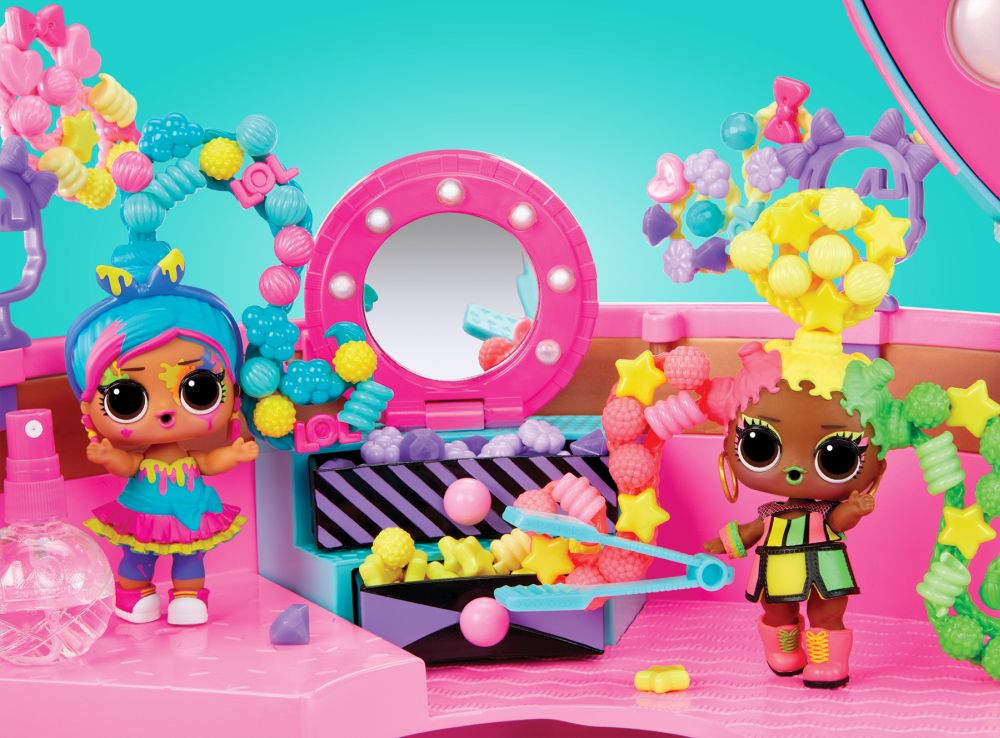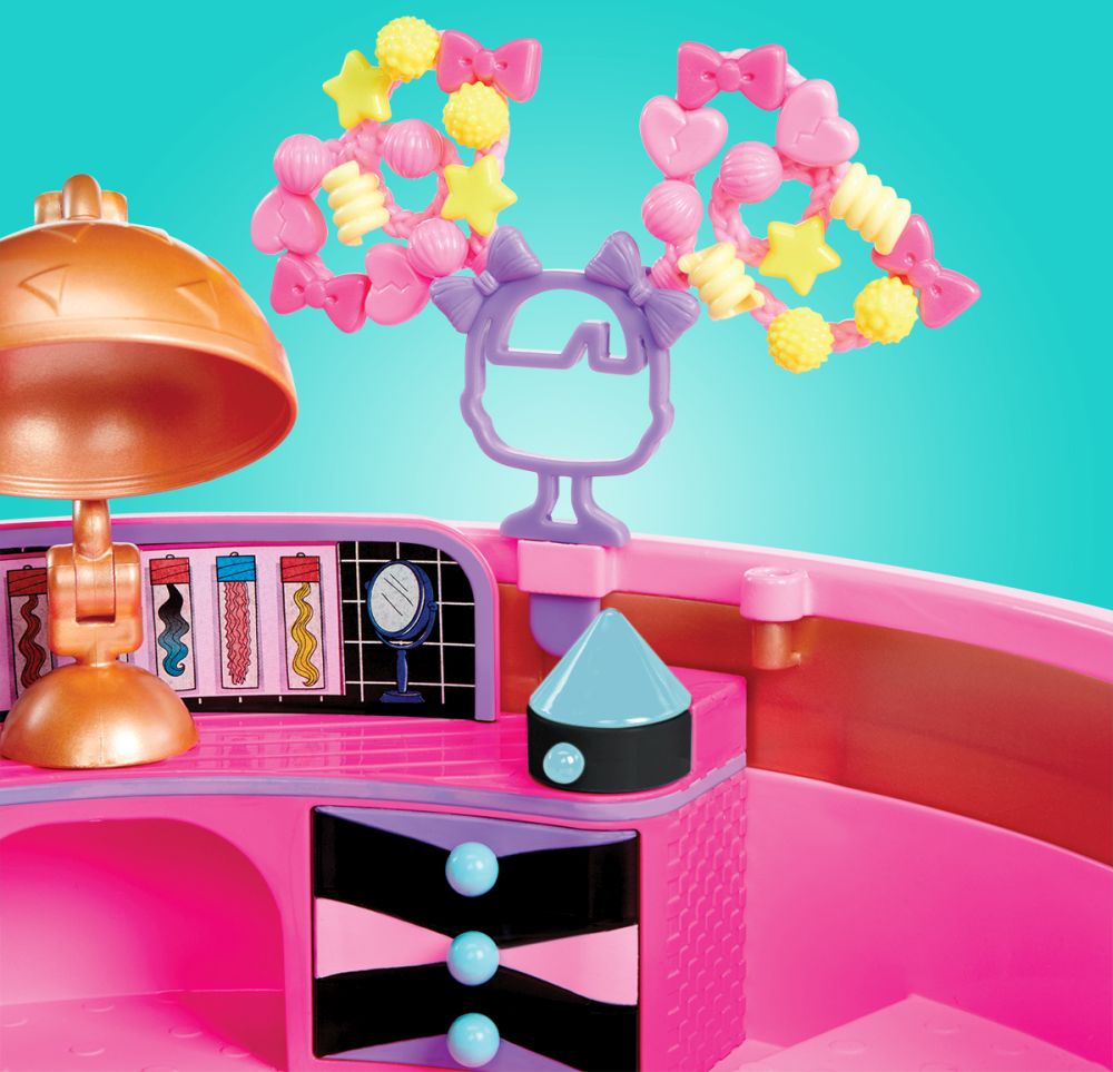 Vytvářej barevné, rozpustilé účesy L.O.L. panenkám v kadeřnickém salónu. Přenosný kufřík rozložíš v prostorný kadeřnický salón s velikým zrcadlem. V přenosném balení najdeš obrovské množství korálků, ze kterých vytvoříš culíčky, copánky nebo třeba drdůlky. Panence stačí vsadit do drdolu pramen vlasů, předem ho namočit na chvilku do vody, a už můžeš korálky skládat. Rozprašovačem z balení navlhčíš hotový účes a necháš ztvrdnout. Když se účes nelíbí, můžeš korálky rozebrat a vytvořit jiný.