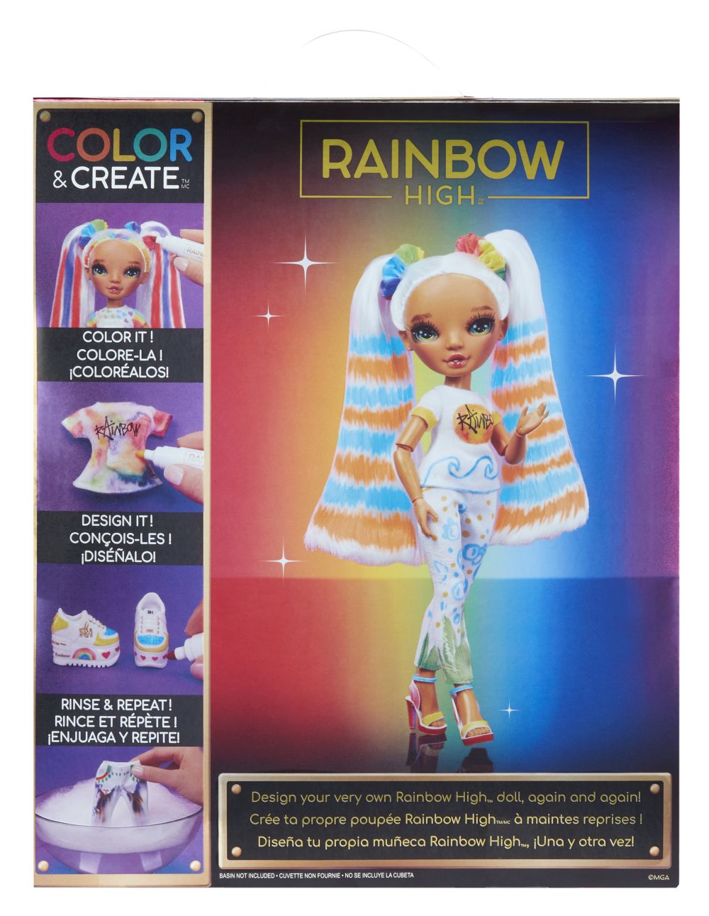 Duha má nekonečné množství barev a teď je na tobě, abys vytvořila vlastní Color panenku. Fashion panenka je oblečená od hlavy až k patě v bílé barvě, má bílé vlasy a ty můžeš vzít 6 omyvatelných fixů z balení a začít navrhovat. Vytvoř jednu ze svých oblíbených Rainbow High panenek nebo navrhni úplně novou. Pak stačí umýt vlasy a oblečení, nechat vše uschnout a začít znovu. Je to snadné. Navrhni, vybarvi, vyper a opakuj! Nech zazářit své barvy.