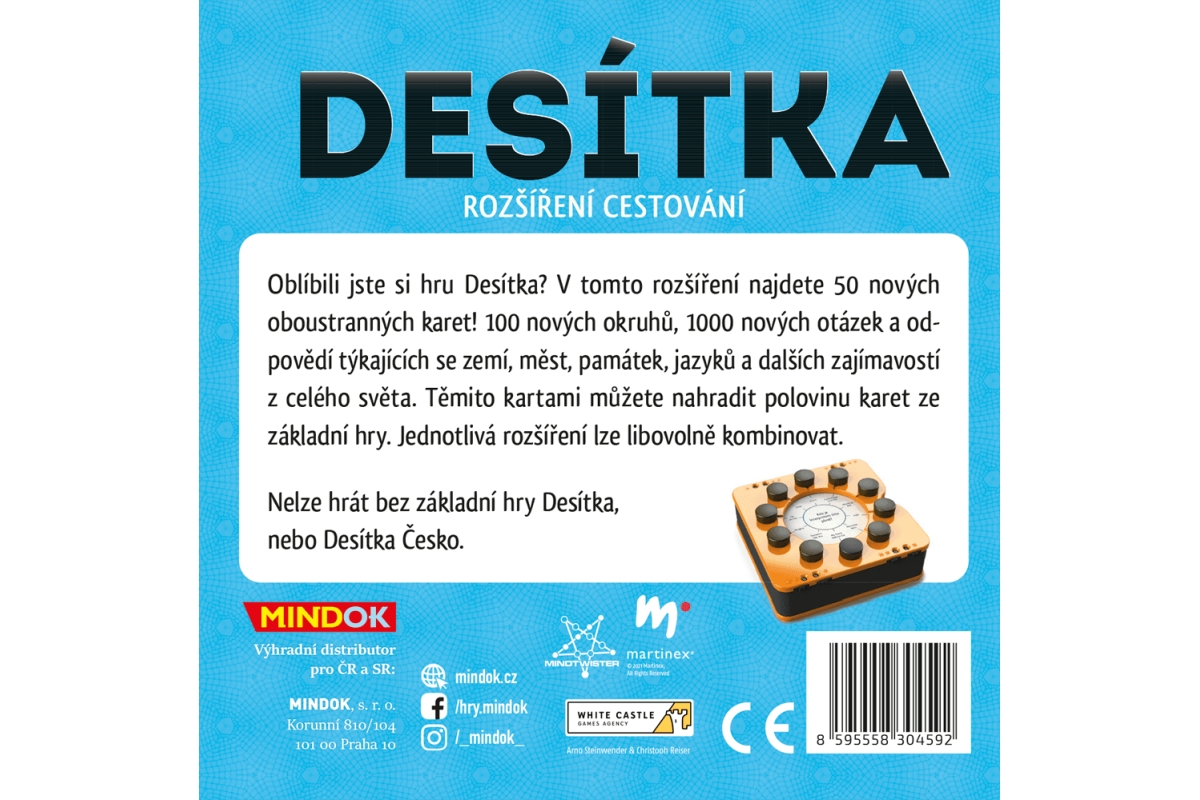 V tomto rozšíření najdete 50 nových oboustranných karet! 100 nových okruhů, 1000 nových otázek a odpovědí týkajících se jídla, pití, kulinářských výrazů, světových delikates, kuchařů či dalších zajímavostí ze světa gastronomie. Těmito kartami můžete nahradit polovinu karet ze základní hry. Jednotlivá rozšíření lze libovolně kombinovat. Nelze hrát bez základní hry Desítka, nebo Desítka Česko. Rozměr balení cca 11,5 x 11,5 x 1,5 cm. Věk 12+