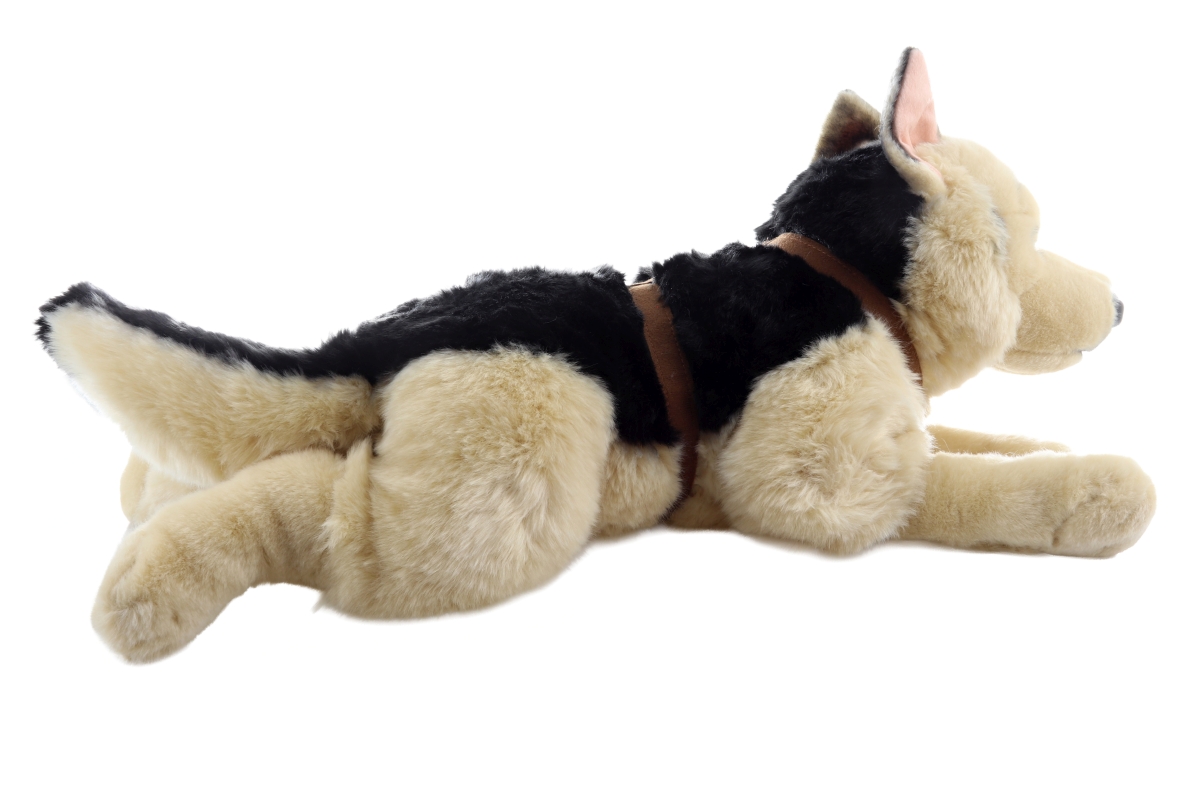Plyšový Německý ovčák ležící s postrojem. Rozměry 60x24x24 cm. Doporučený věk 3+..