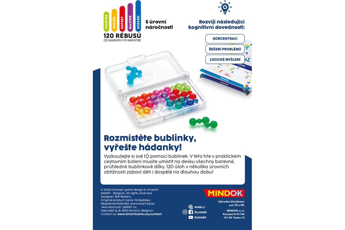 IQ Bubliny je zábavný hlavolam pro jednoho hráče, ve kterém musíte umístit všechny oboustranné dílky na šachovnicově střídající se desku. Pozor, dílky se skládají z bublinek dvou velikostí a každá bublina se vejde jen na políčko odpovídající velikosti. Je to skutečná výzva pro vaše prostorové myšlení – každá úloha má jen jedno řešení! Věk 7+