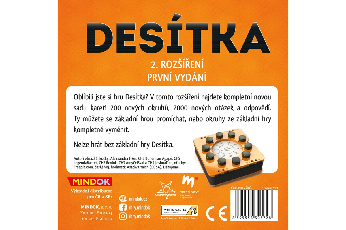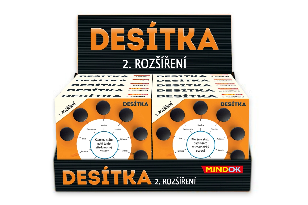 Oblíbili jste si hru Desítka? V tomto rozšíření najdete kompletní novou sadu karet! 200 nových okruhů, 2000 nových otázek a odpovědí. Ty můžete se základní hrou promíchat, nebo okruhy ze základní hry kompletně vyměnit. Nelze hrát bez základní hry Desítka. Určeno pro 2-8 hráčů. Věk 10+