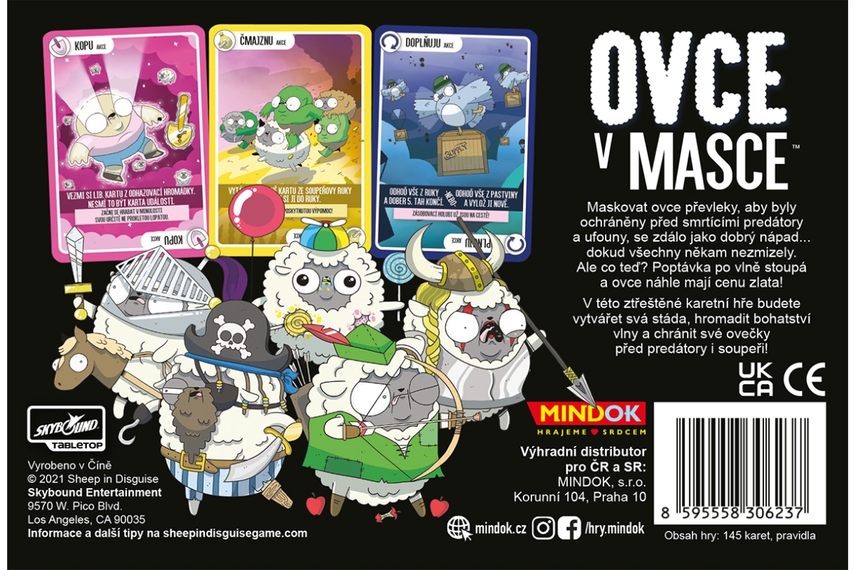Ovce v masce je svižná karetní hra, ve které se snažíte sbírat sady ovcí, abyste vytvořili stáda. Používejte akční karty k narušení plánů soupeřů a chraňte svá stáda před odhalením. Vítězem se stává ten, kdo jako první shromáždí potřebný počet stád a zároveň nemá žádné stádo odmaskované! Určeno pro 2-6 hráčů. Věk 10+