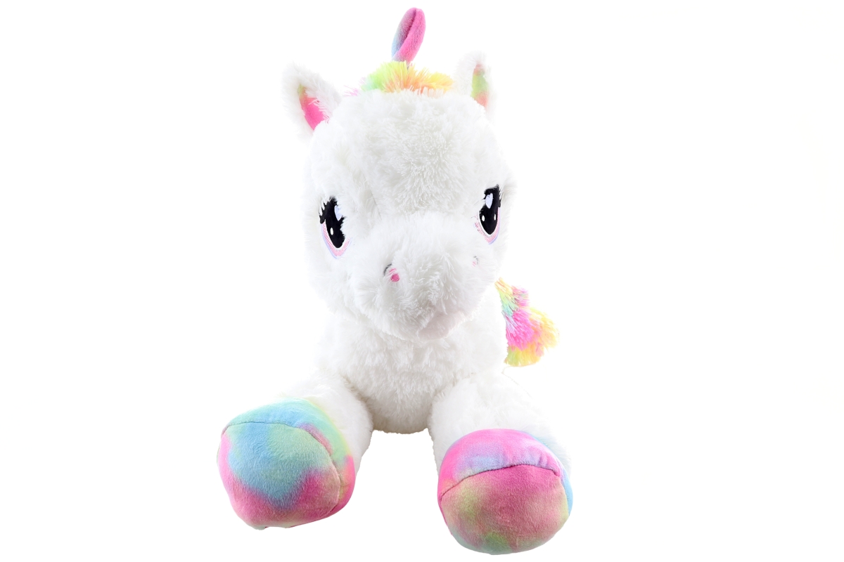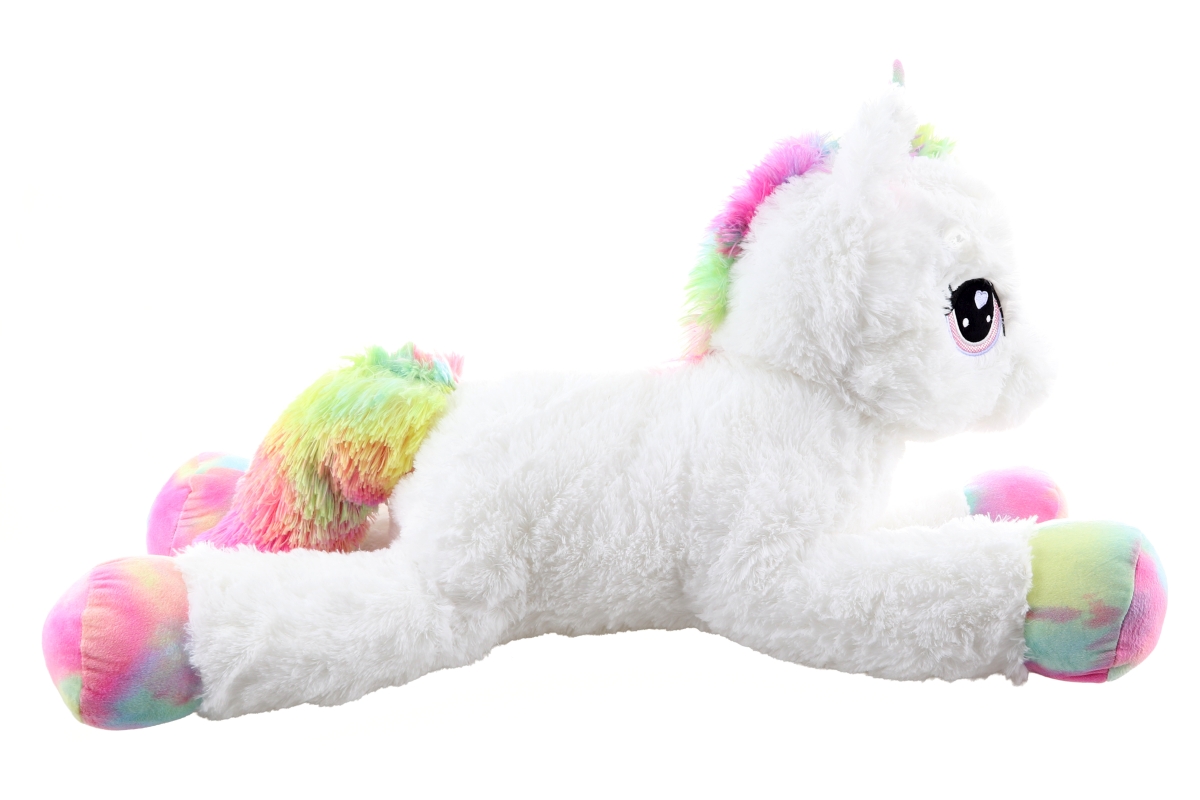 Plyšový ležící jednorožec - bílý s duhovými doplňky. Rozměry cca 80x45x23 cm. Věk 0+..