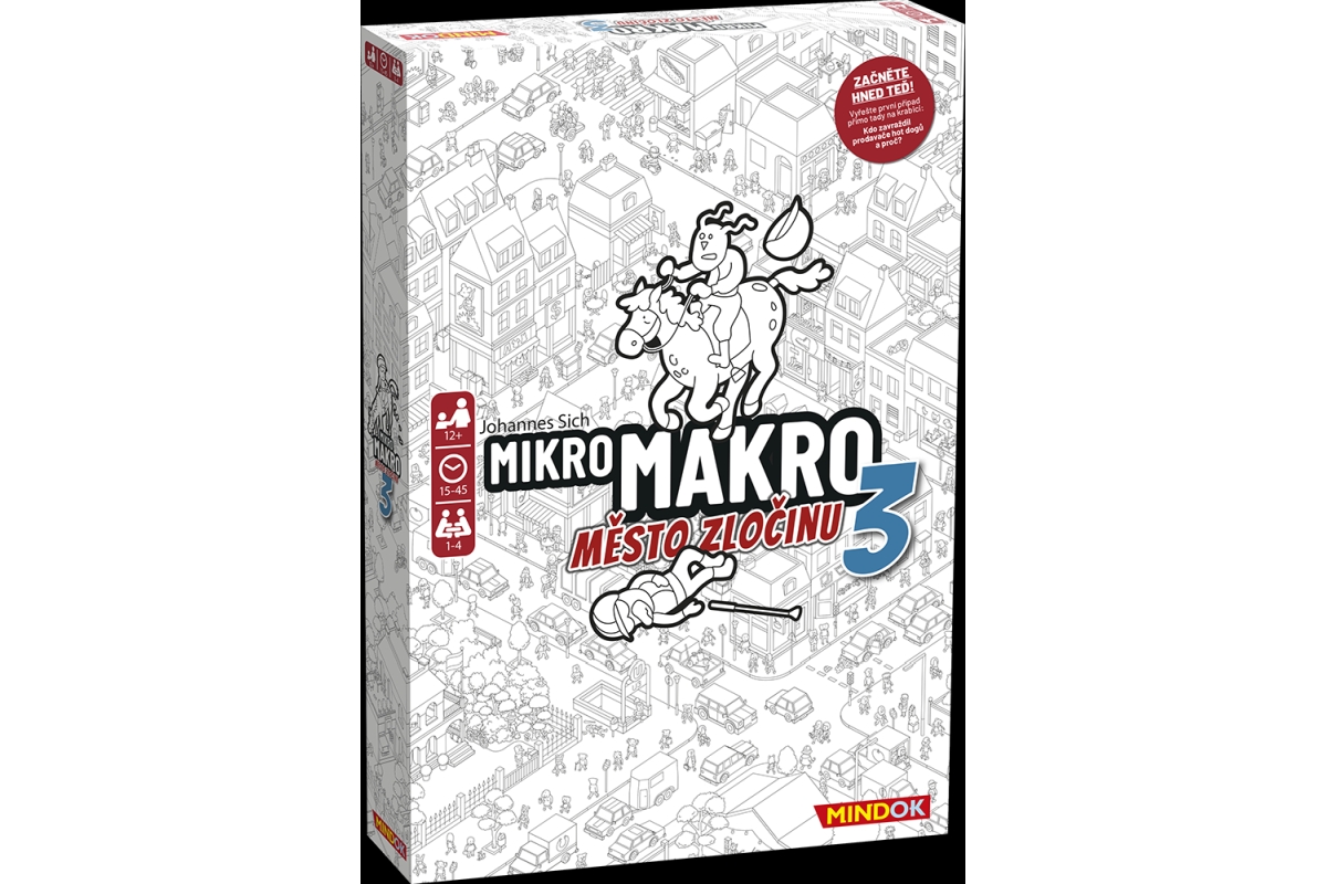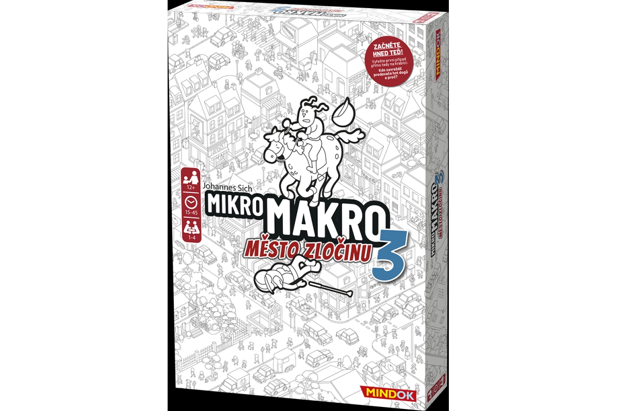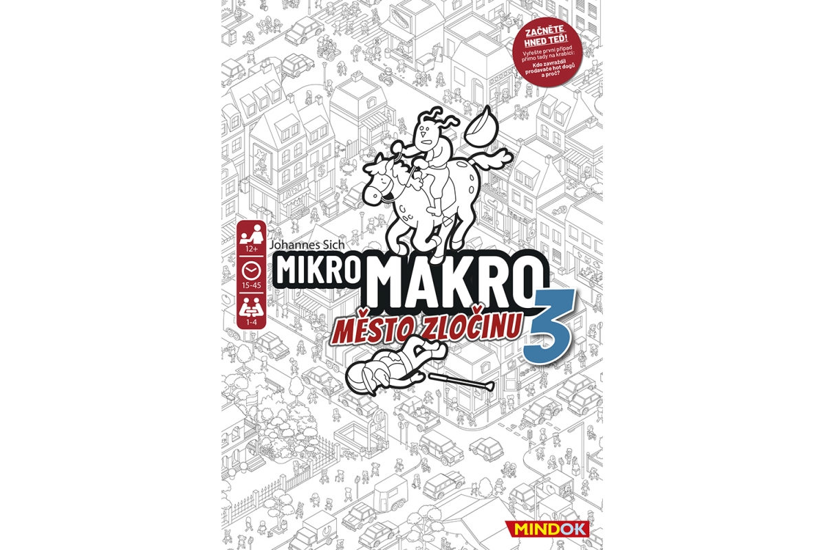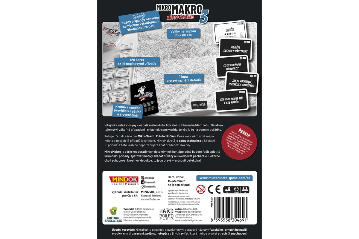 Vítají vás Velké Zlosyny – ospalé maloměsto, kde zločin číhá na každém rohu. Osudová tajemství, zákeřná přepadení i chladnokrevné vraždy, to vše je tu na denním pořádku. Toto je třetí díl série her MikroMakro: Město zločinu. Čeká vás v něm nová mapa města a nových 16 případů k vyřešení. MikroMakro 3 je samostatná hra a k řešení 16 případů z této krabice nepotřebujete znát předchozí dva díly. MikroMakro je série kooperativních detektivních her. Společně budete řešit spletité kriminální případy, zjišťovat motivy, hledat důkazy a usvědčovat pachatele. Pozorné oko i schopnost kreativní dedukce, to jsou pravé vlastnosti detektiva! Rozměr balení cca 19 x 27,5 x 4 cm. Věk 12+
