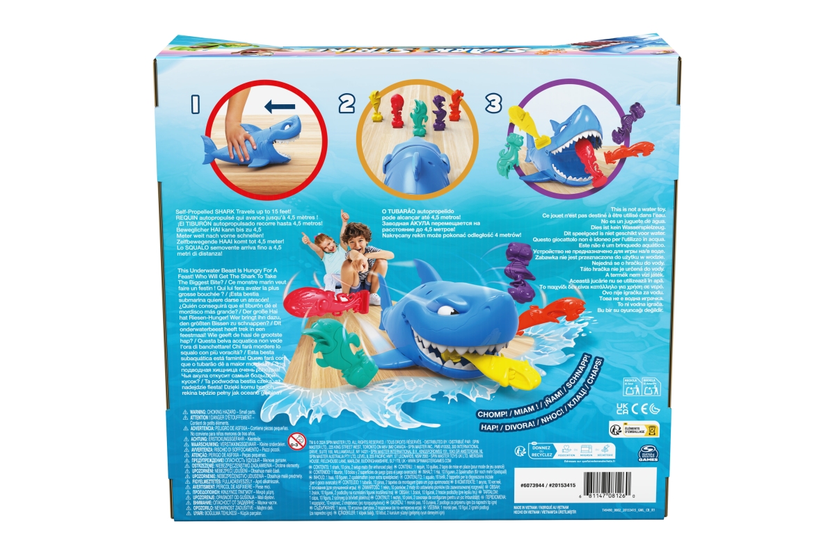 Žralok je hladový a vyráží na lov. 2 hráči nebo týmy se postaví proti sobě. Na zemi postaví své figurky rybiček. Mladší hráč začíná. Natáhne žraloka a pošle ho proti figurkám protihráče. Žralok se rozjede s otevřenou tlamou a hýbajícím ocasem a se štěstím trefí figurky protihráče, které mu pak skončí v tlamě. Hráč který protihráči sežere více figurek na 3 pokusy vyhrává. Rozměry balení 27x25x13 cm. Doporučený věk 5+
