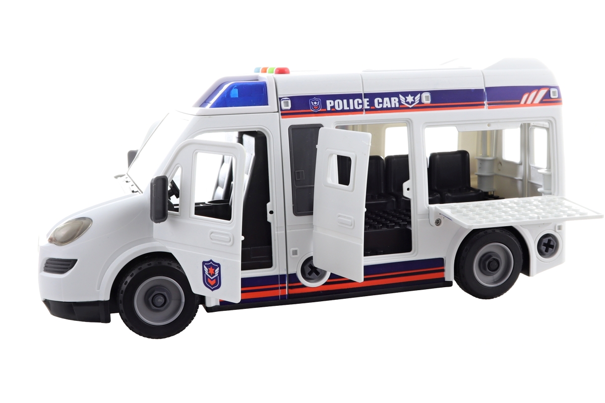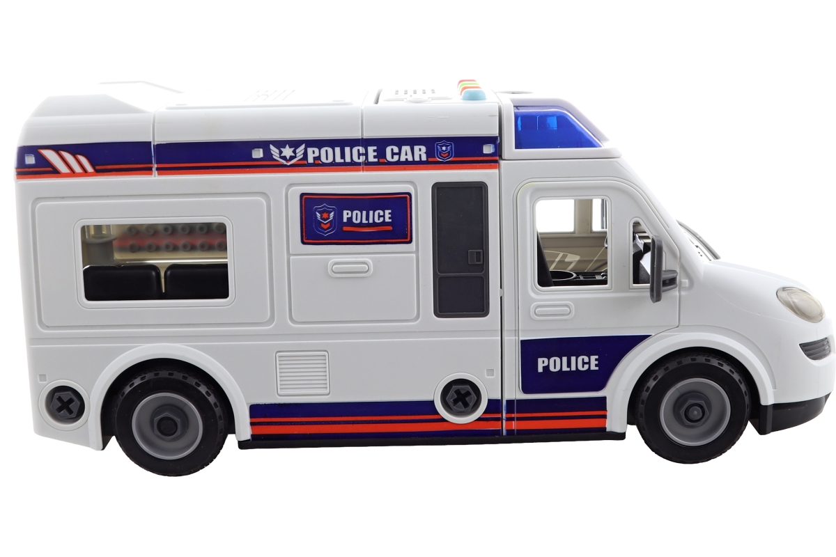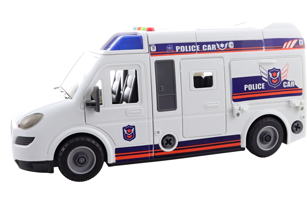 Rozkládací šroubovací policejní auto na baterie. Napájení na 3xAG13 baterie - jsou součástí balení. Auto má 4 tlačítka s různými zvuky - startování, troubení, couvání, melodie. Balení obsahuje šroubovák. Auto je na setrvačník. Rozměry auta cca 30x14x10 cm. Rozměry balení 35x18x14 cm. Věk 3+