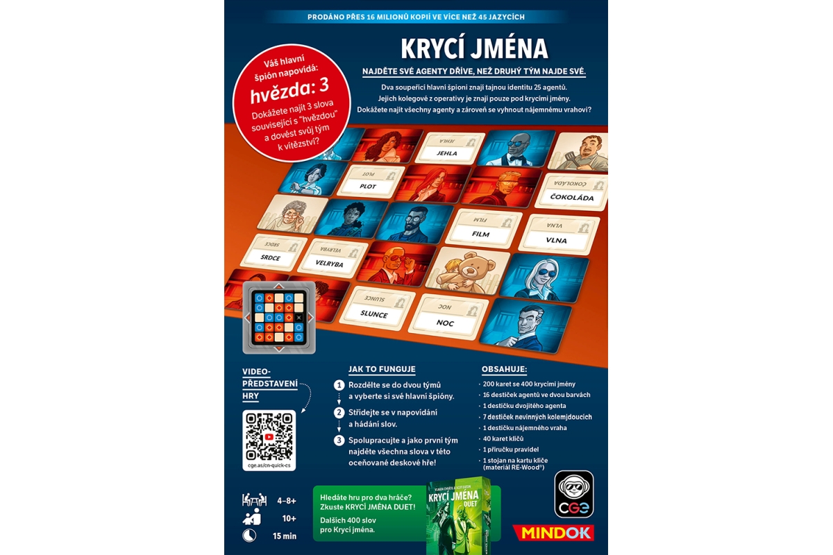 Původní česká hra autora Vlaadi Chvátila sbírající úspěchy po celém světě – vítěz nejprestižnějšího světového ocenění Spiel des Jahres 2016, nejlepší párty hra historie dle celosvětové herní databáze www.boardgamegeek.com. Slovní asociační hra pro dva týmy tajných agentů. Vaším úkolem bude odhalit jména všech agentů vašeho týmu dříve, než tak učiní soupeř. Pozor si však musíte dávat na nájemného vraha, který hru okamžitě ukončí! Skvělá hra pro větší partu lidí, kde je důležitá komunikace, sledování soupeře a vymýšlení originálních asociací. Hra má nejen nový design, ale je vylepšena i uvnitř krabice. Jednotlivá slova prošla přísnou kontrolou a některá hru opustila a byla nahrazena novými kartami. Ve hře je proti původním edicím změněno asi 10% – 15% slov. Pravidla hry také prošla revizí, aby více sedla novým hráčům. Určeno pro 4-8 hráčů. Věk 10+