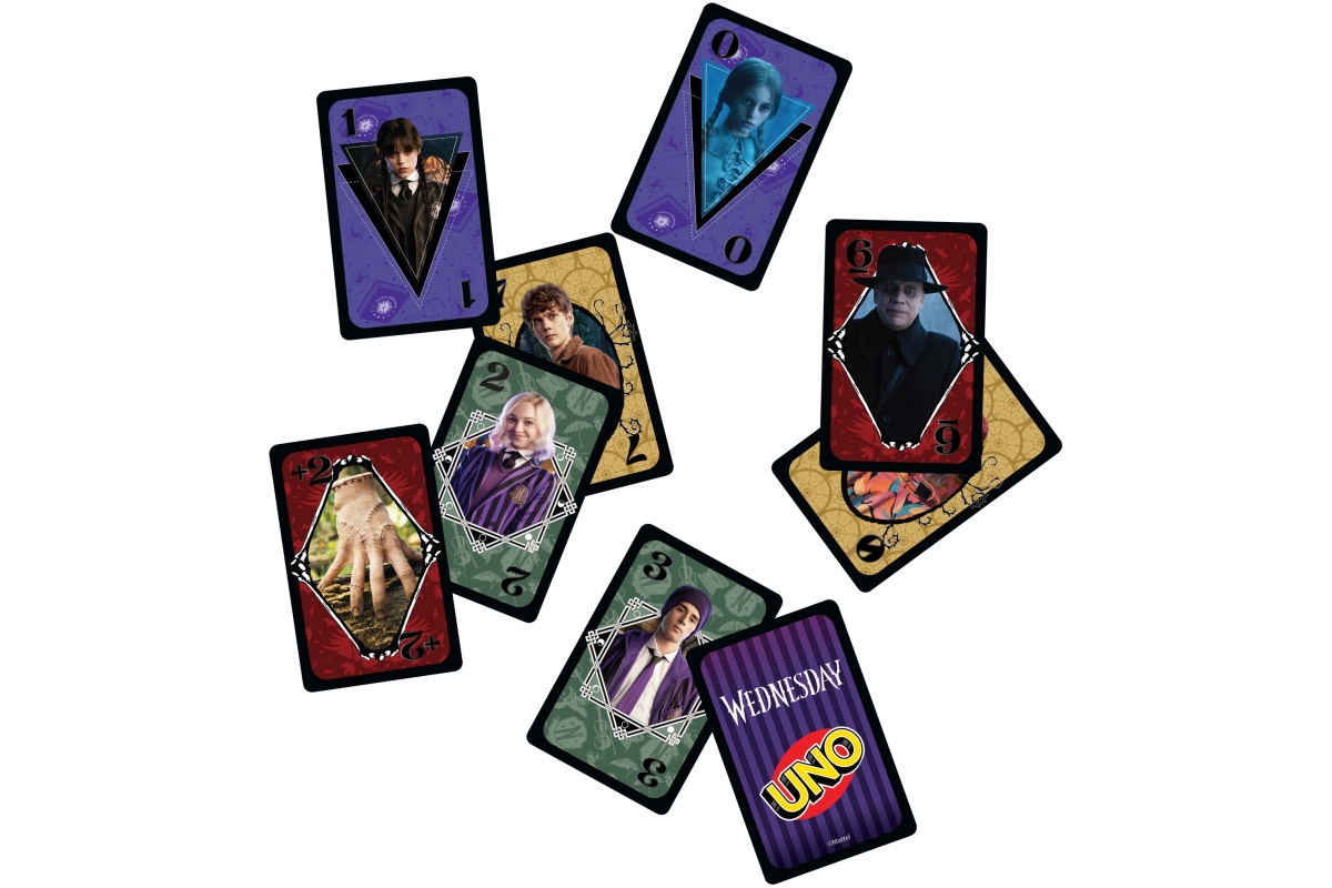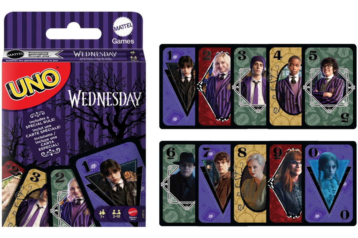 Klasická hra, kterou znáte a máte rádi, s motivy z strašidelného seriálu Wednesday, která navíc obsahuje speciální pravidlo! A když vám zůstane poslední karta, nezapomeňte křičet UNO! Skvělý dárek pro fanoušky seriálu Wednesday a milovníky karetních her. Barvy a vzhled karet se mohou lišit. Rozměry 9x14x2 cm. Doporučený věk 7+