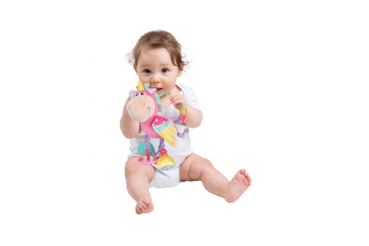 Vaše dítě si zamiluje naše růžové chrastítko ve tvaru jednorožce. Tento okouzlující a interaktivní jednorožec nejenže rozveselí každé miminko, ale také stimuluje jeho smyslový vývoj. Děti od 3 měsíců budou nadšeny z barevných korálků, zvuků chrastítka, různorodých textur a tvarů, které nabízí. Chrastítko je navrženo tak, aby podporovalo jemnou motoriku vašeho dítěte. Drobná ručička bude objevovat různé korálky, chrastítka a textury, což napomůže při rozvoji koordinace ruka-oko a jemných motorických dovedností. Věk 3m+