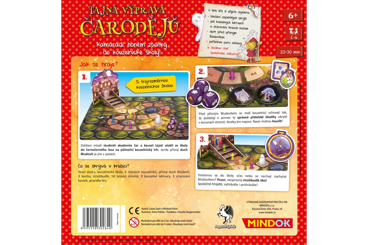 Kamarádi, honem zpátky do kouzelnické školy! Zvědaví mladí studenti akademie čar a kouzel tajně utekli ze školy do černočerného lesa na půlnoční kouzelnický trh. Jenže přísný duch Bludovít je jim v patách. Před přísným Bludovítem se malí kouzelníci schovají tak, že požádají o pomoc ty správné přátelské bludíky ukryté v korunách stromů. Kostky jim napoví. Navíc mohou kouzlit! Dostanou se do školy včas nebo se nechají nachytat Bludovítem? Pozor, neúprosný strašibudík tiká! Společně hrajete, vyhráváte i prohráváte! Pro 2-6 hráčů. Věk 6+