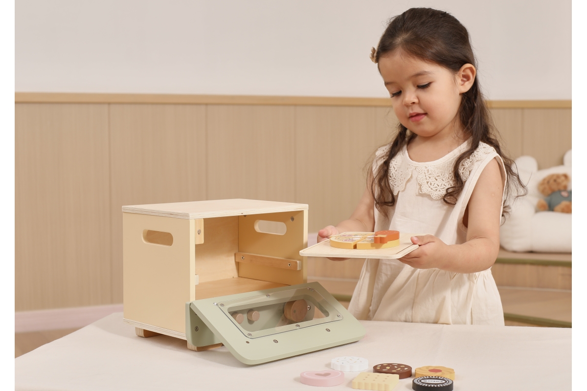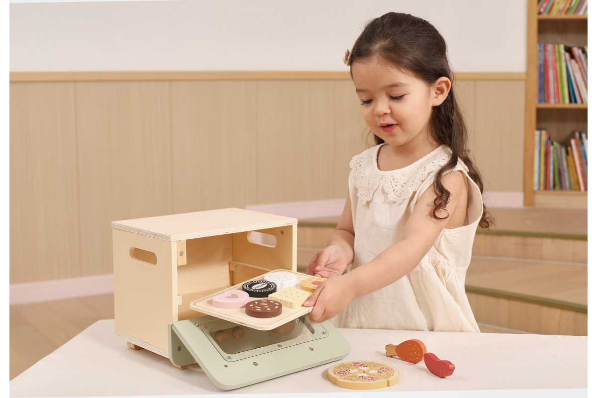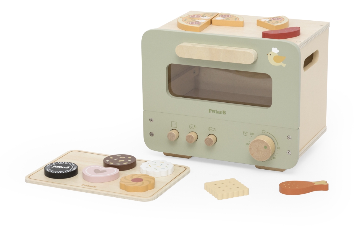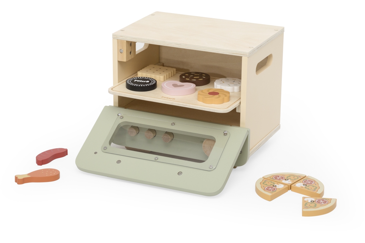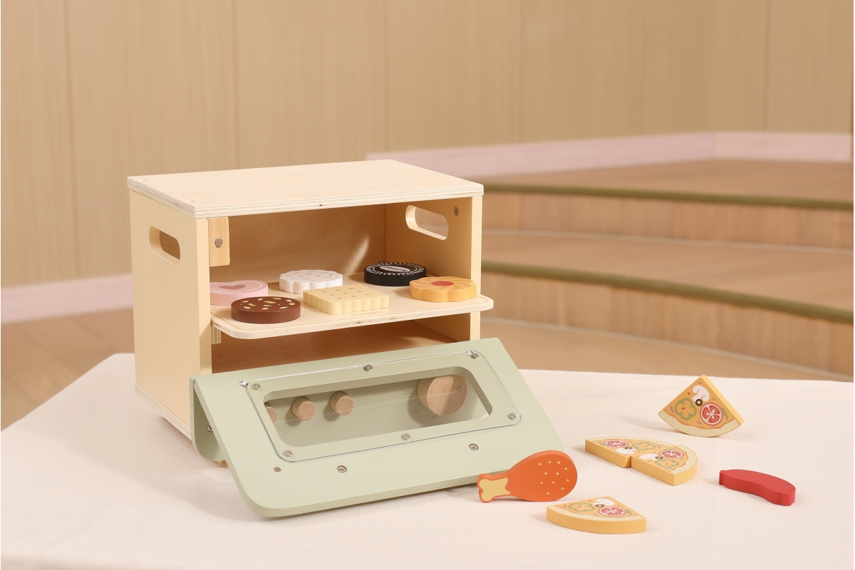 Dřevěná trouba s potravinami. Balení obsahuje troubu o rozměrech 25x18,6x20,7 cm, oplatky, pizzu, párek a kuřecí paličku. Baleno v krabici. Rozměry ba..