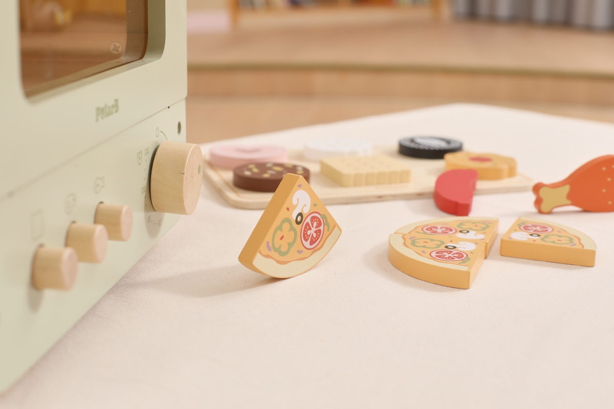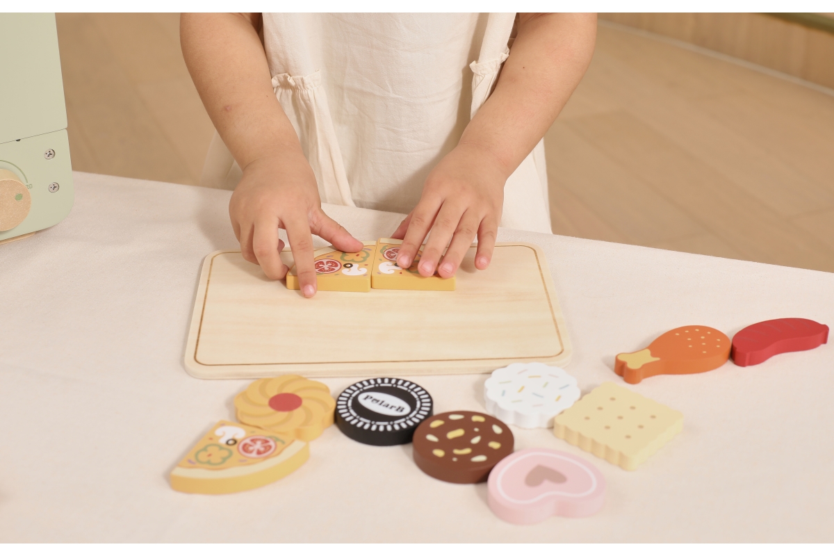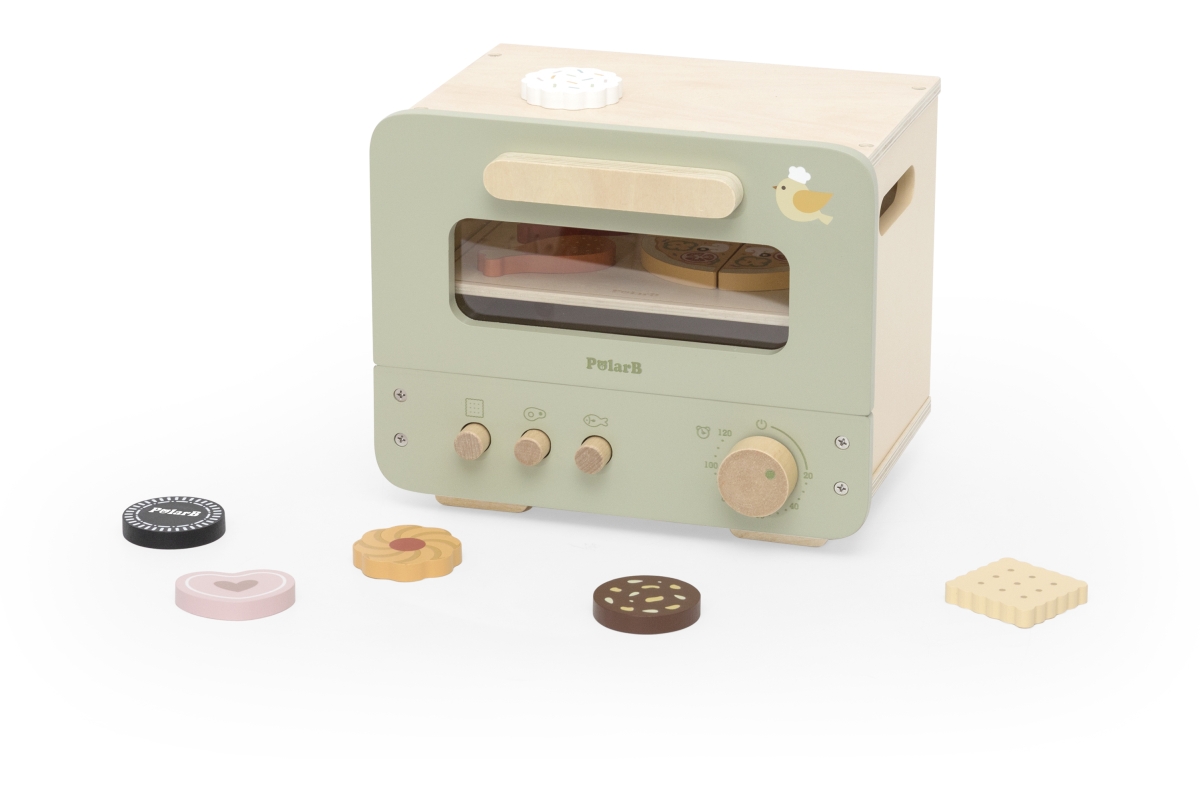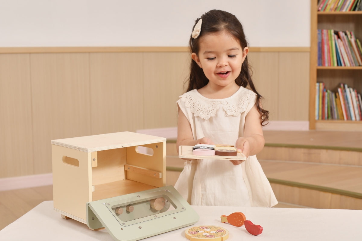 Dřevěná trouba s potravinami. Balení obsahuje troubu o rozměrech 25x18,6x20,7 cm, oplatky, pizzu, párek a kuřecí paličku. Baleno v krabici. Rozměry ba..