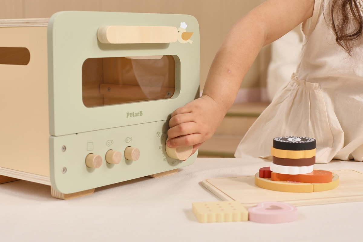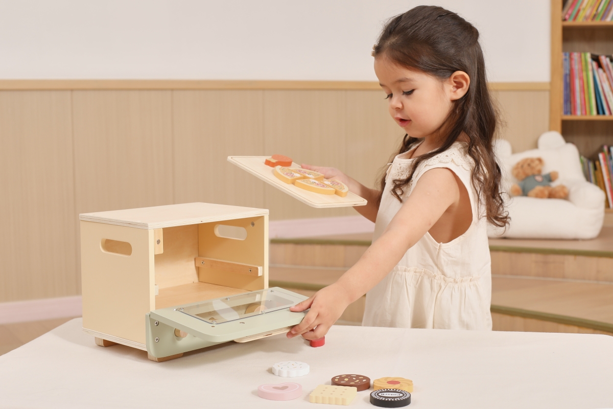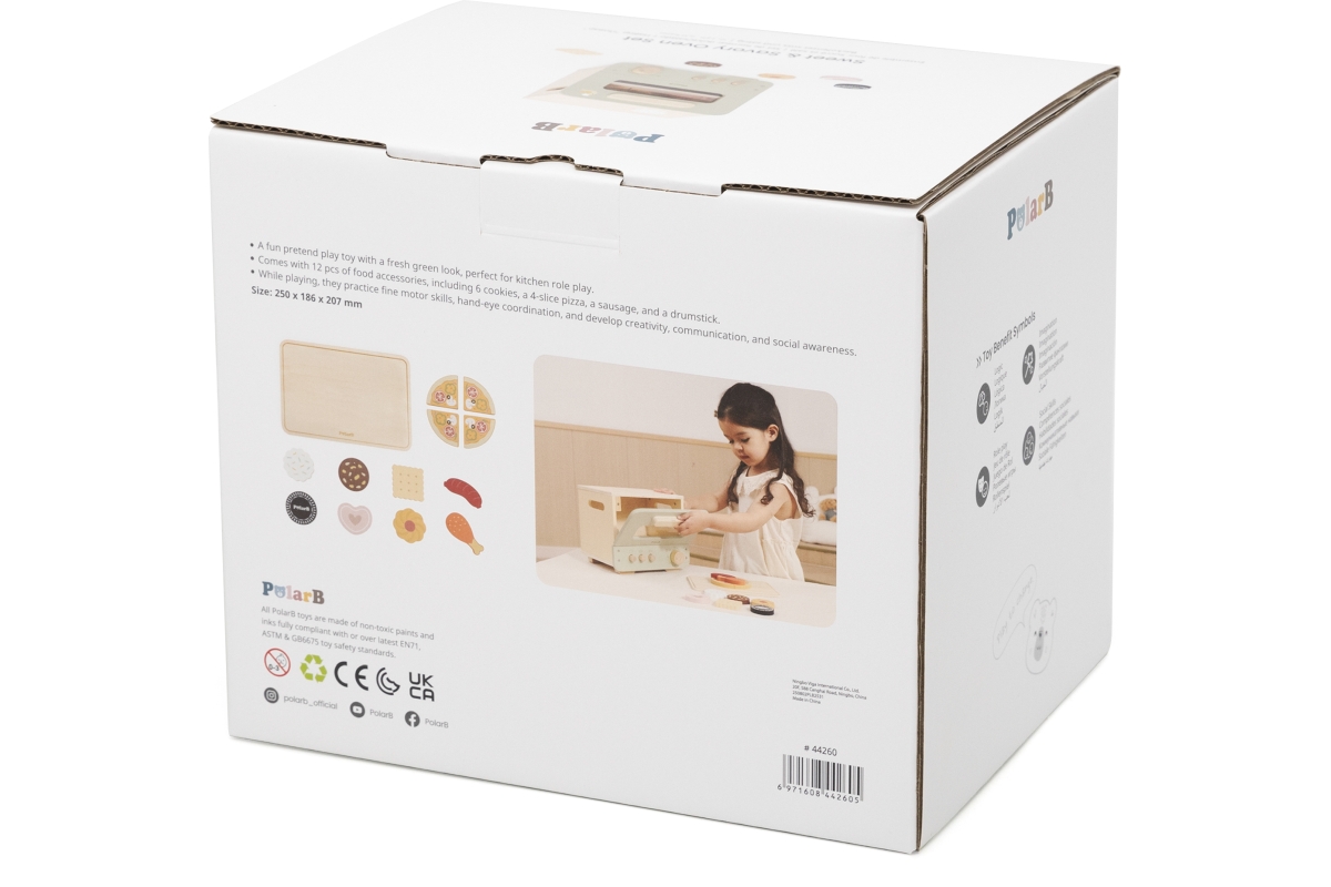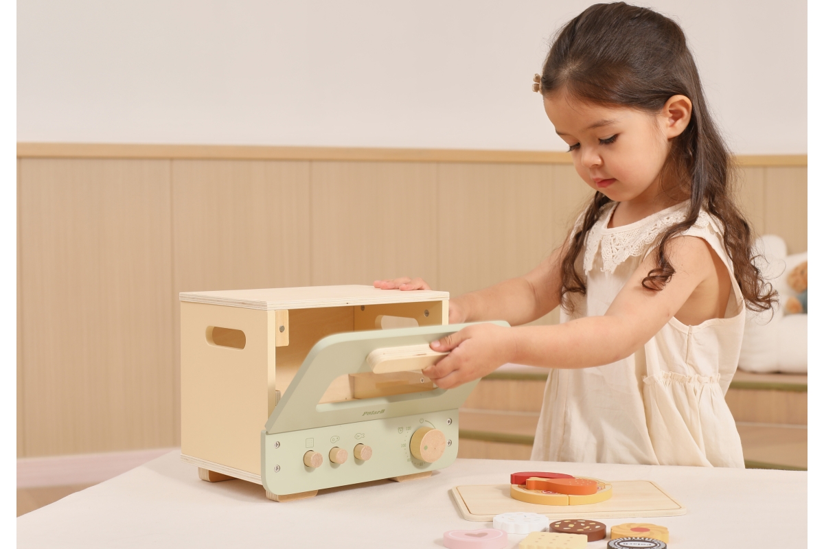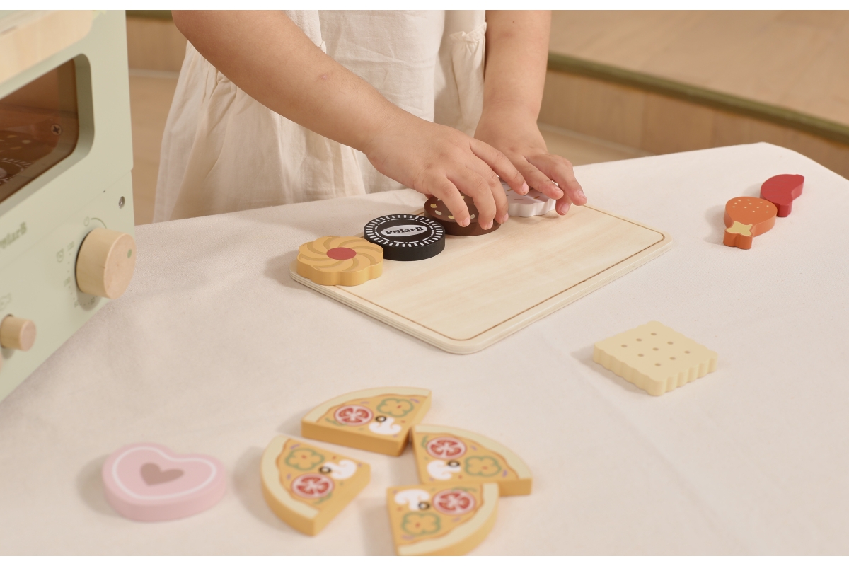 Dřevěná trouba s potravinami. Balení obsahuje troubu o rozměrech 25x18,6x20,7 cm, oplatky, pizzu, párek a kuřecí paličku. Baleno v krabici. Rozměry ba..