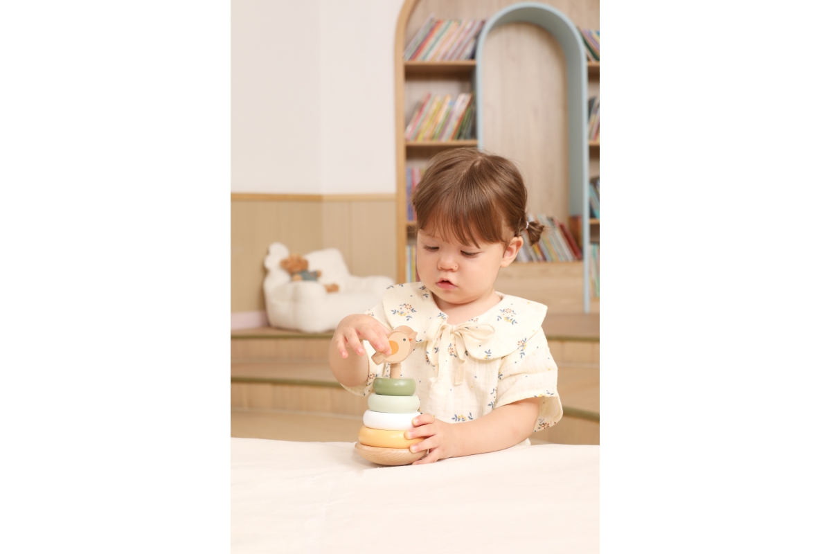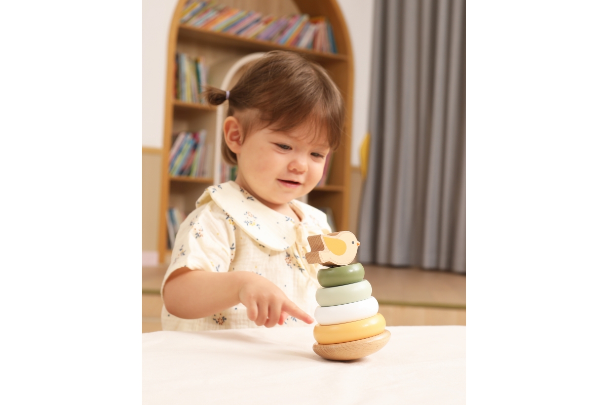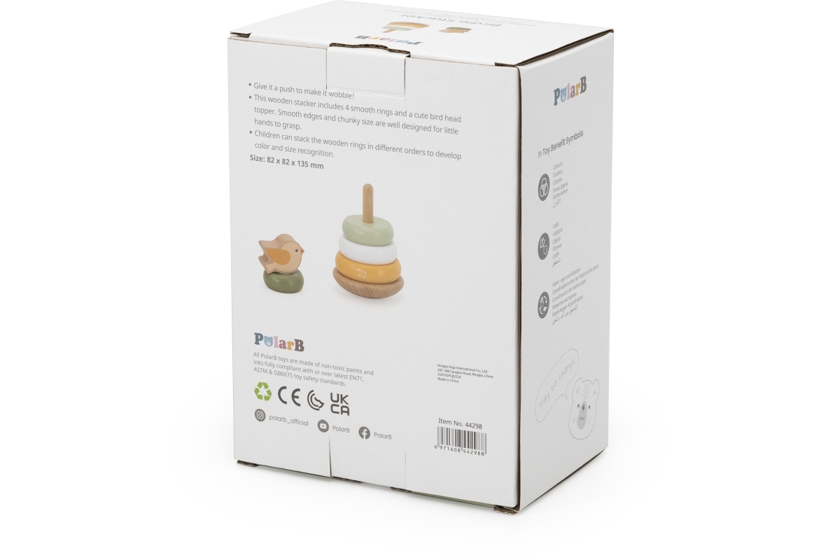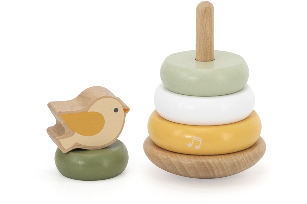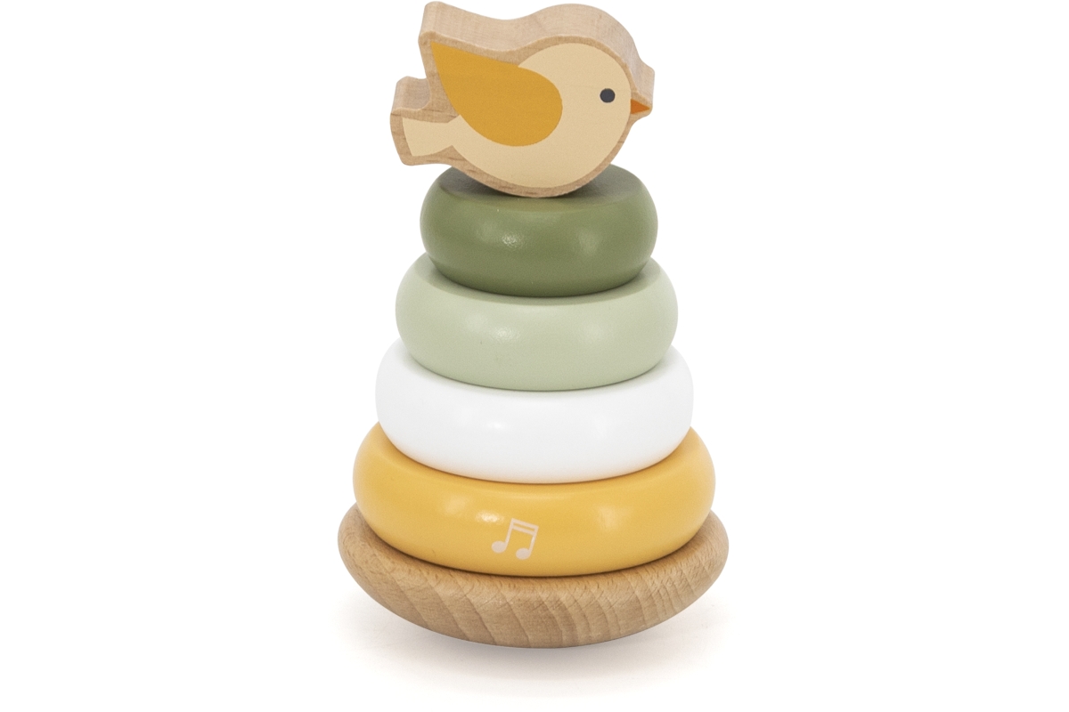 Dřevěná pyramida s ptáčkem. Rozměry pyramidy 8,2x8,2x13,5 cm. Rozměry balení 13x9x18 cm. Baleno v krabici. Věk 12m+..