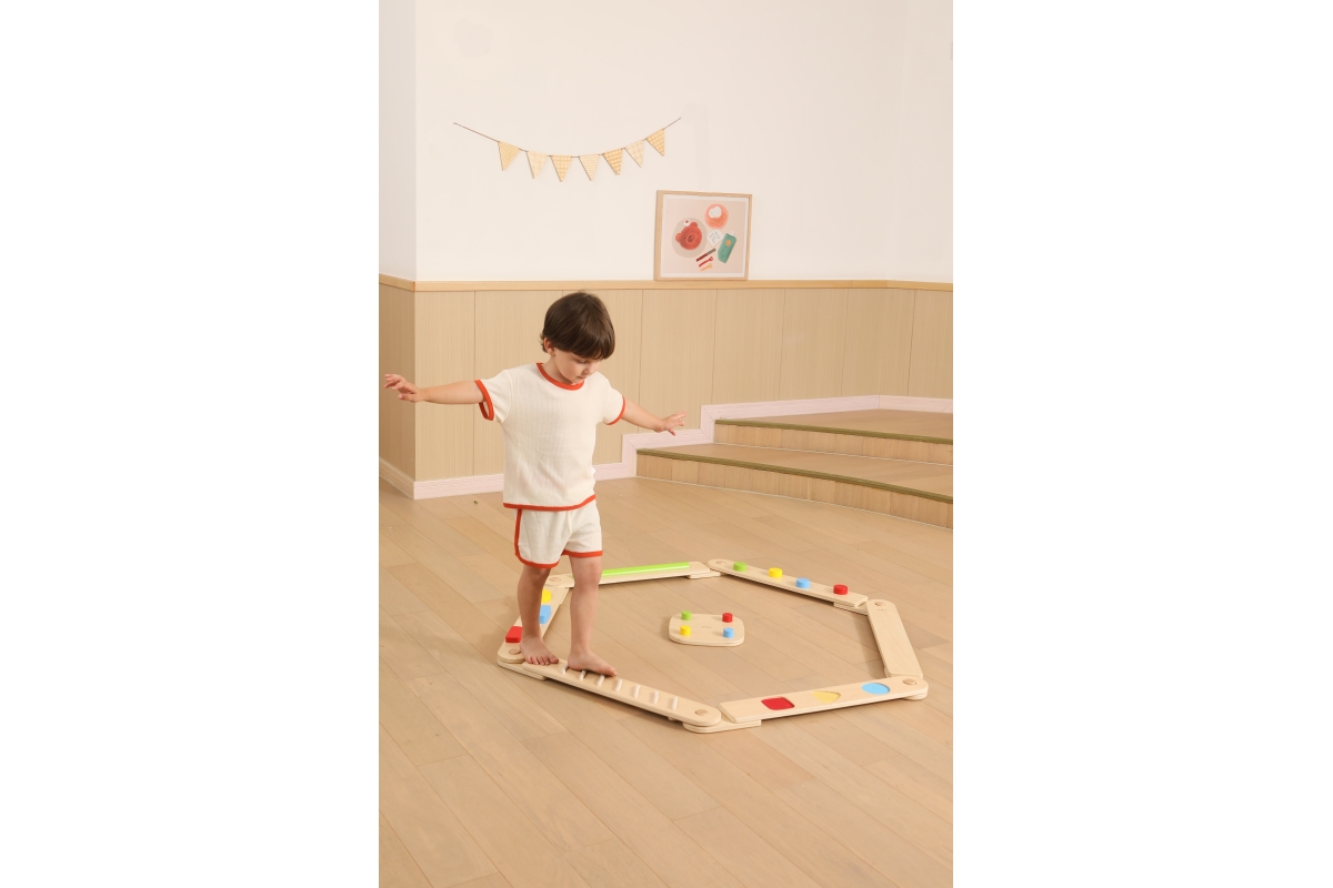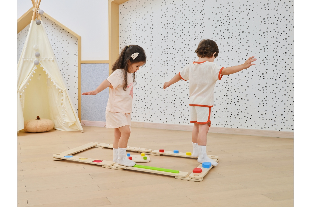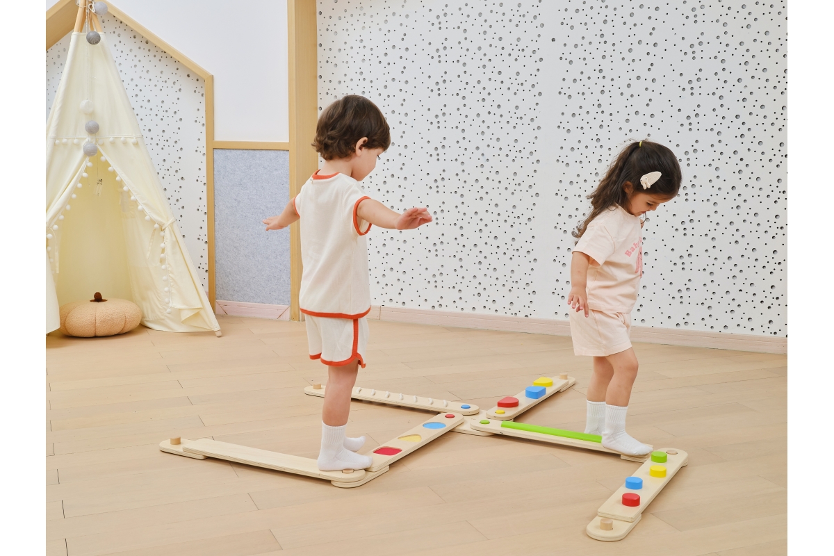 Dřevěná balancující cesta - děti si mohou kombinovat různé druhy desek a navrhovat si vlastní vyvažovací cesty, od jednoduchých procházek až po náročné stezky, čímž si posílí koordinaci, kreativitu a sebevědomí.Balení obsahuje desek o rozměru 70x9,5 cm a čtverec o rozměru 22,5x22,5 cm. Baleno v krabici. Rozměry balení 72x30x12 cm. Věk 24m+