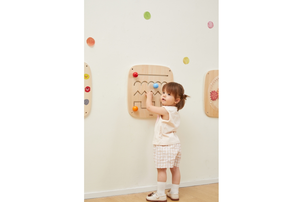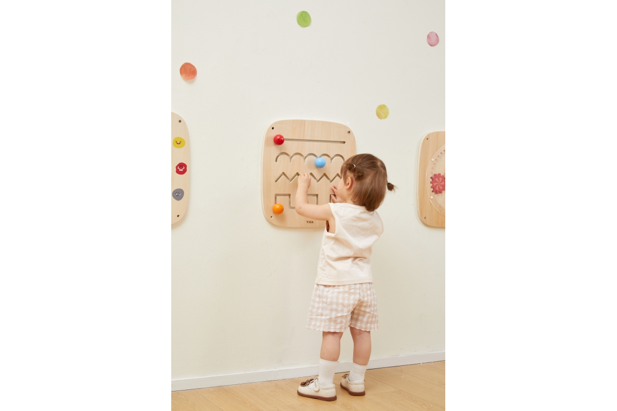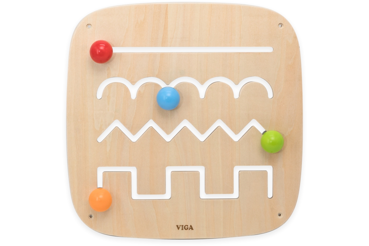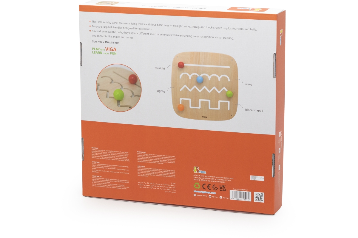 Dřevěný nástěnný panel s výukou kreslení základních linií. Rozměry panelu 40x40x5,2 cm. Baleno v krabici. Rozměry balení 41x41x6 cm. Věk 12m+..
