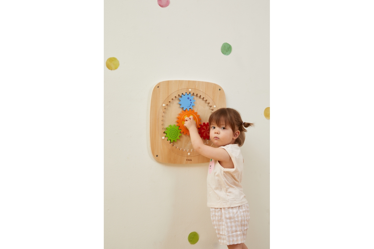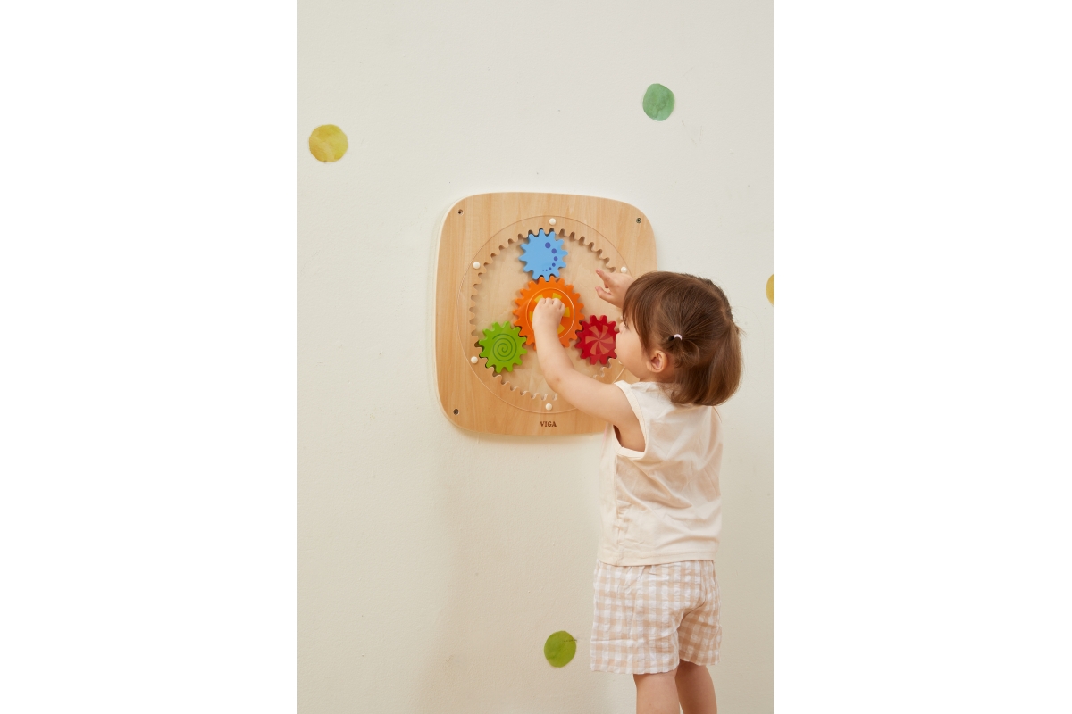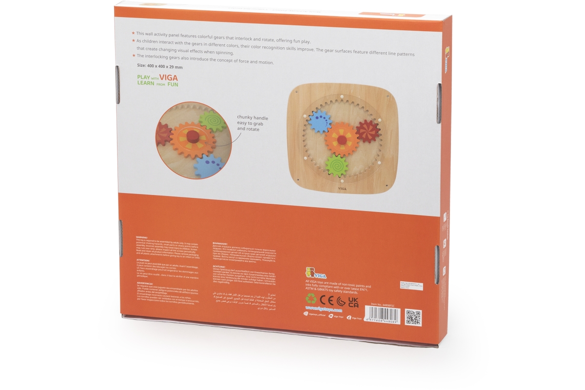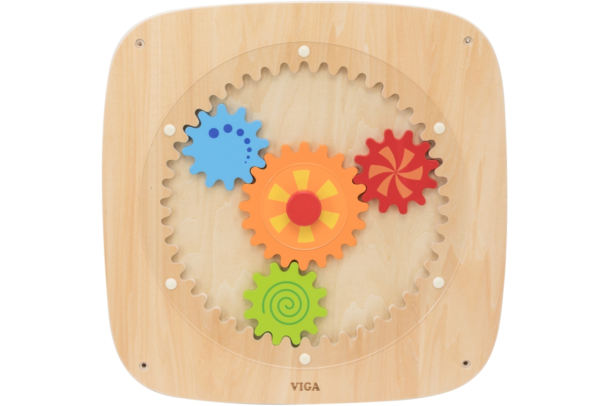Dřevěný nástěnný panel s ozubenými kolečky. Rozměry panelu 40x40x2,9 cm. Baleno v krabici. Rozměry balení 41x41x4 cm. Věk 12m+..