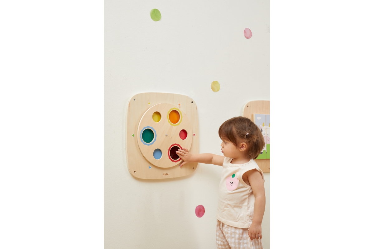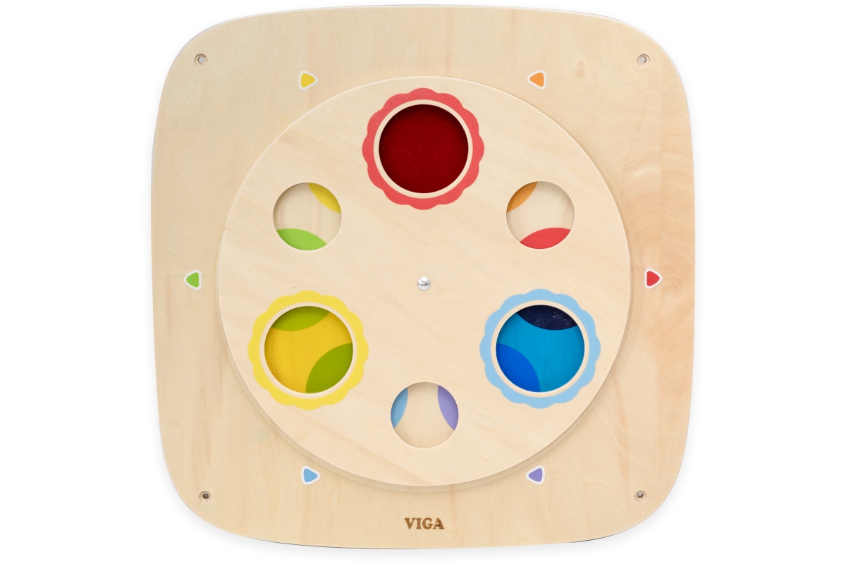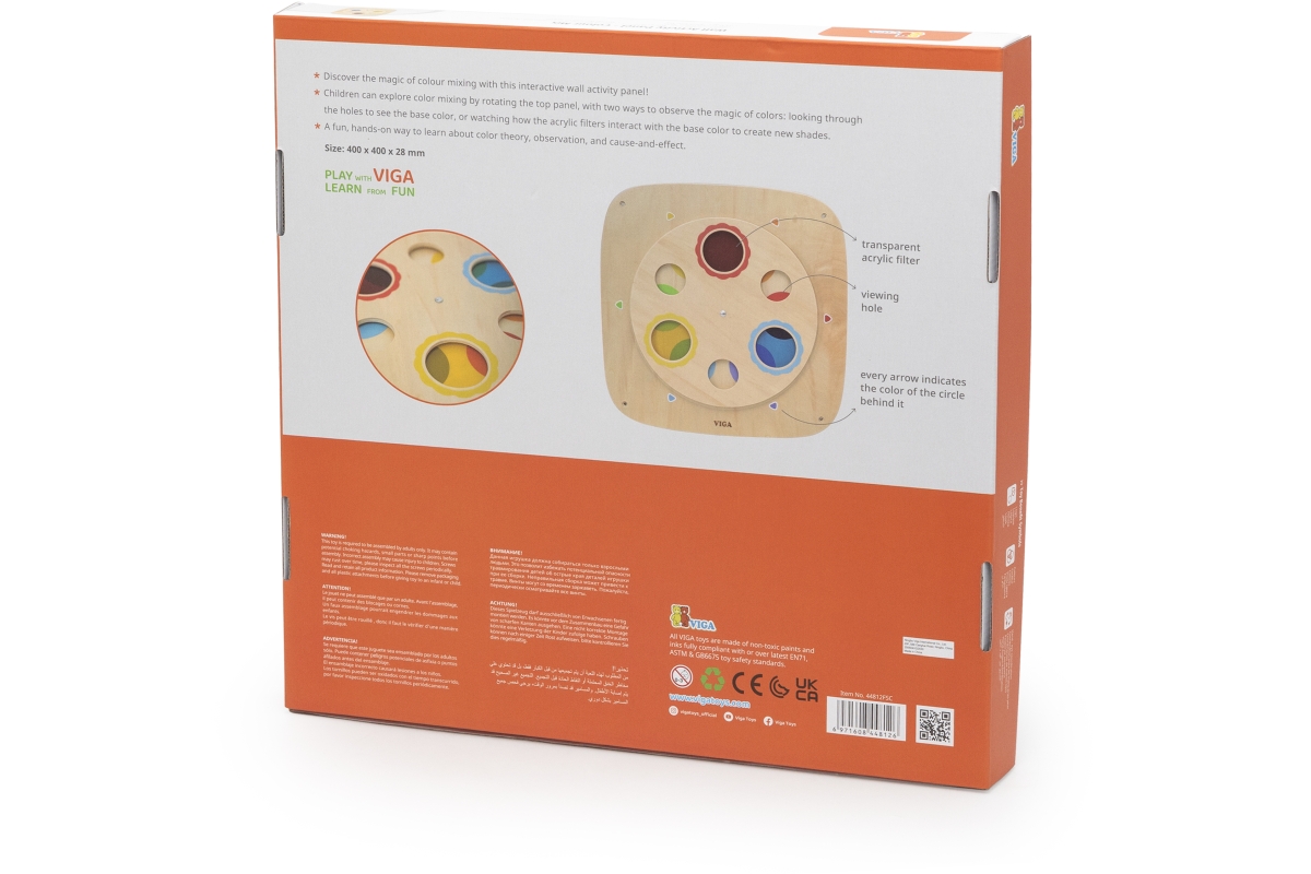 Dřevěný nástěnný panel s barvami. Děti se učí závabným způsobem mixování barev. Rozměry panelu 40x40x2,8 cm. Rozměry balení 41x41x4 cm. Věk 3+..