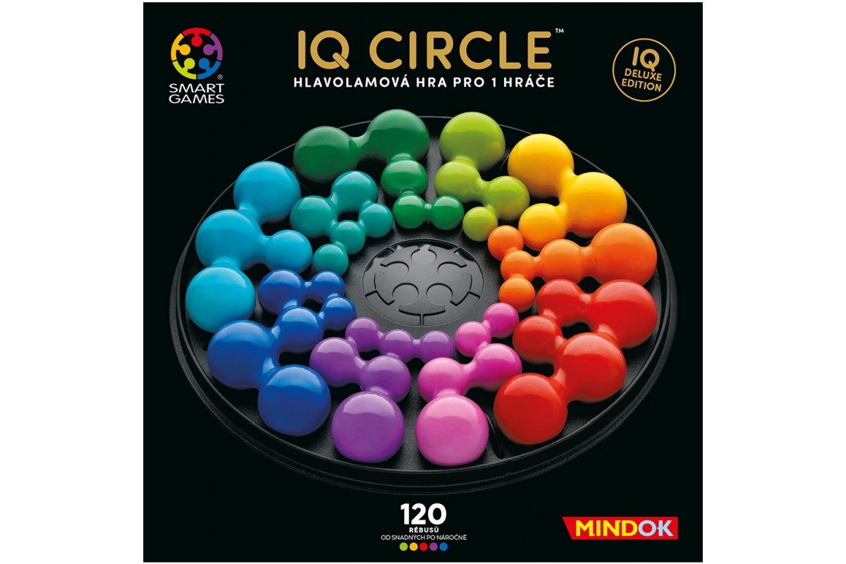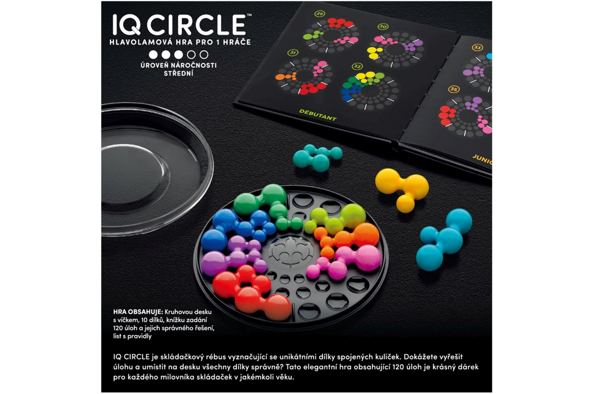 IQ Circle je kruhový hlavolam pro jednoho hráče, ve kterém musíte umístit oboustranné dílky do tří prstenců tak, aby kuličky správné velikosti zapadly do odpovídajících prstenců. Vyzvěte svou logiku v úlohách, kde musíte správně natočit i celou desku, a snažte se najít jediné správné řešení! Určeno pro 1 hráče. Věk 14+