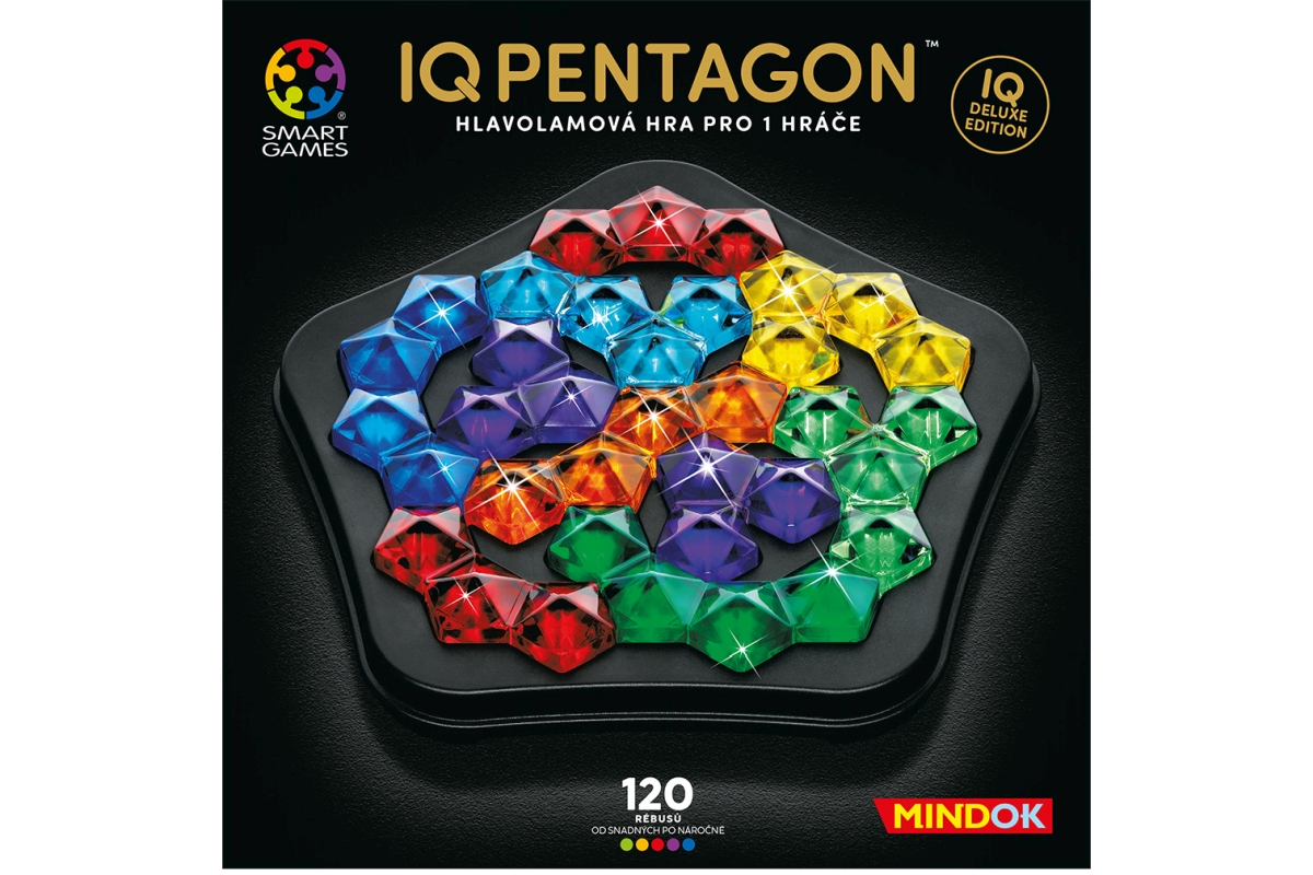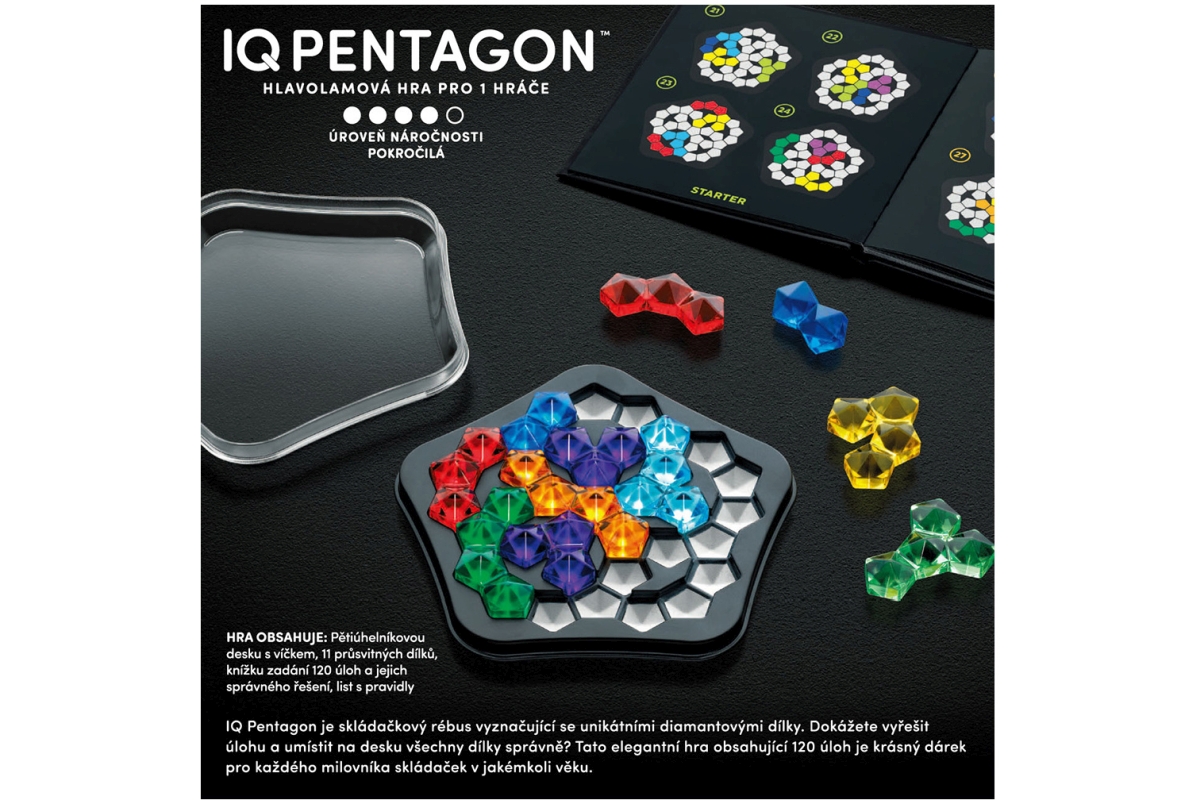 IQ Pentagon je chytře vymyšlený hlavolam, ve kterém je vaším úkolem vyplnit celou hrací desku oboustrannými dílky. Vyberte si úlohu z knížky a začněte se startovní pozicí, poté hledejte to jediné správné řešení pro danou výzvu. Perfektní trénink mozku pro každého milovníka rébusů! Určeno pro 1 hráče. Věk 14+