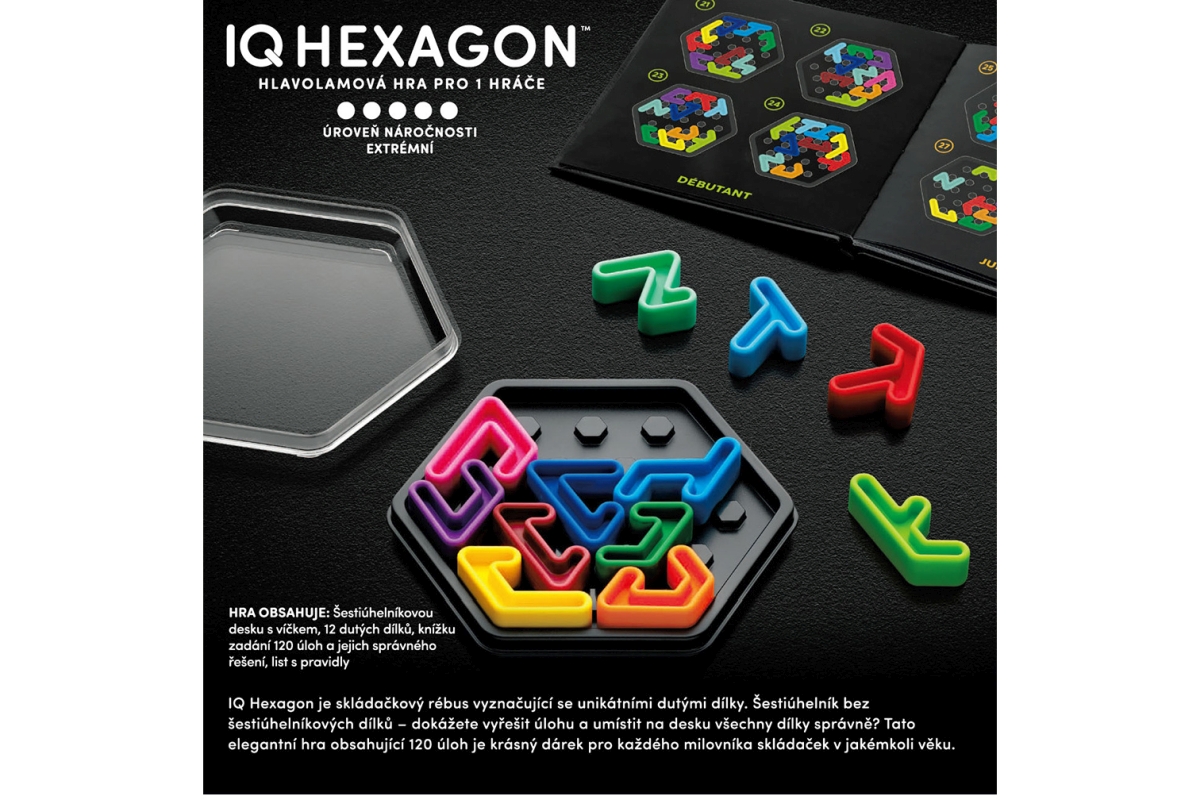 IQ Hexagon je chytrý logický hlavolam, ve kterém musíte vyplnit hrací desku všemi oboustrannými dílky. Začněte se startovní pozicí podle knížky zadání..