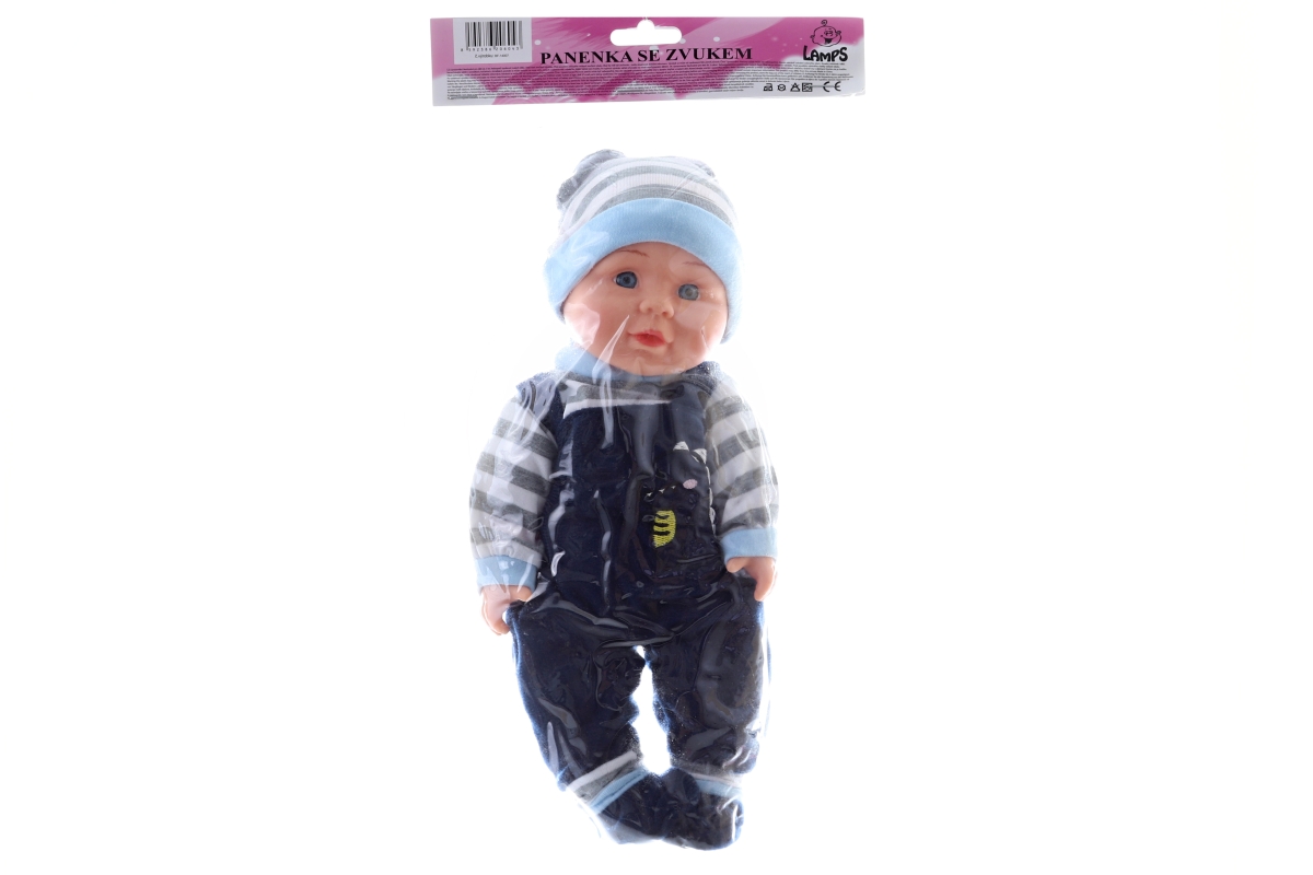 Miminko s měkkým tělíčkem. Po stlačení tělíčka začne miminko vydávat zvuky (smích, pláč, mama, tata). Miminko je oblečeno do barevného pyžámka, které lze sundat (suchý zip). Rozměry miminka cca 30 x 15 x 6 cm. Baleno v plastovém sáčku.Provoz na 3 knoflíkové baterie. Věk 3+