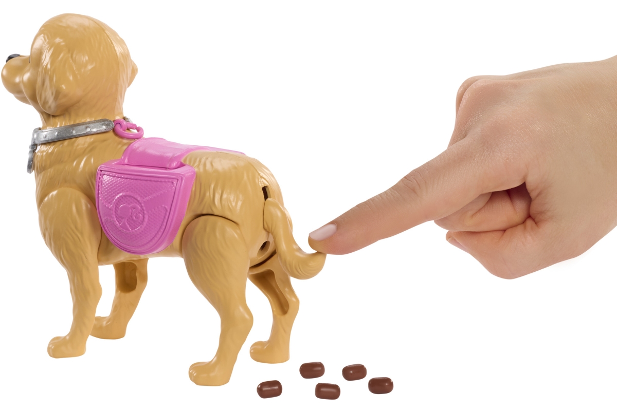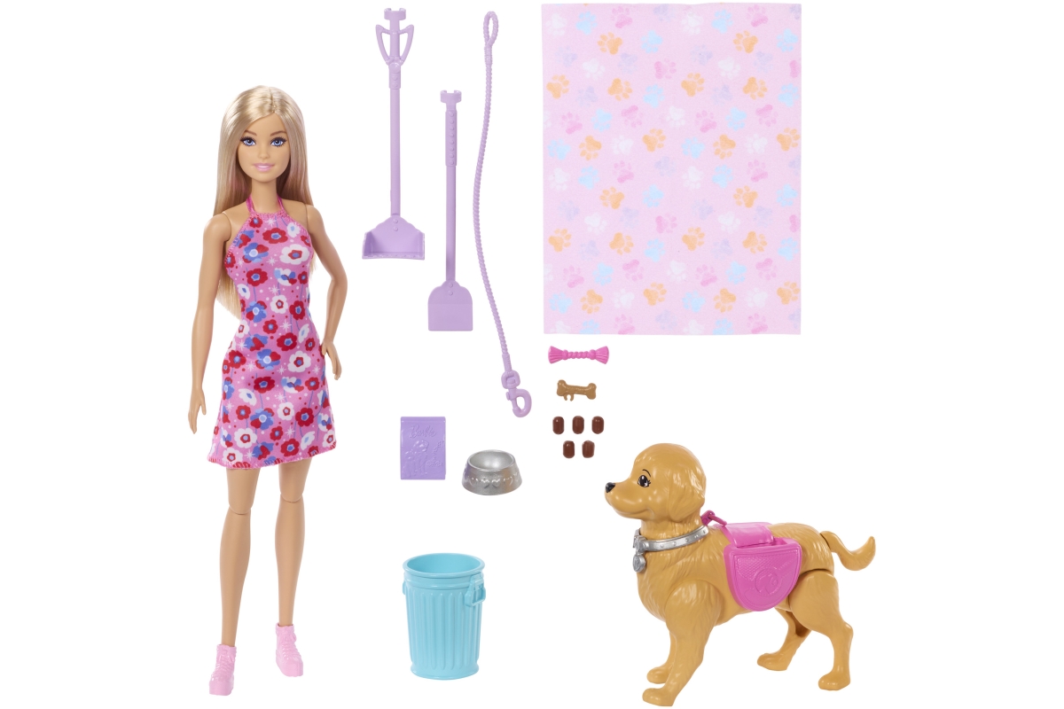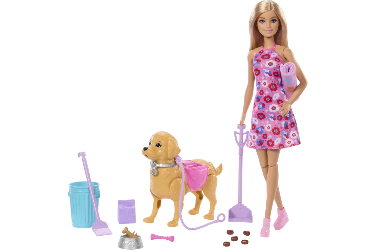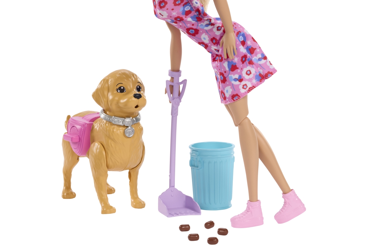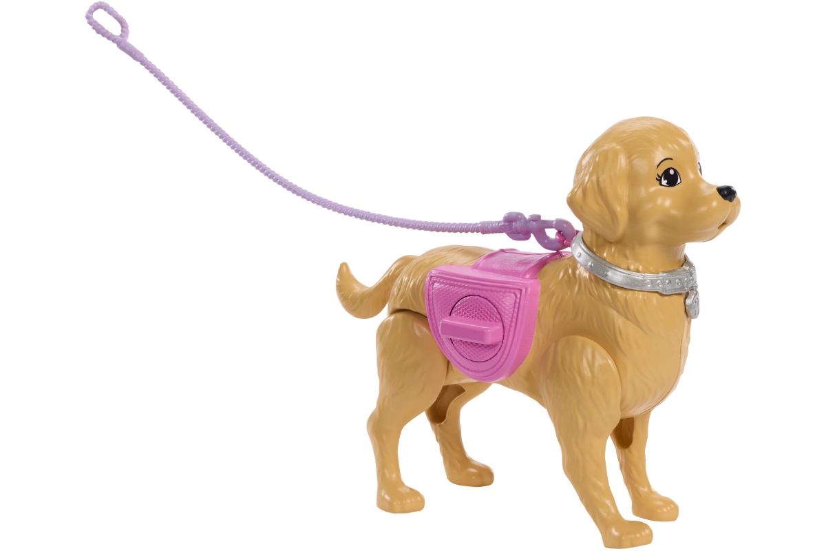 Vydejte se na procházku s panenkou Barbie a jejím pejskem! Pejsek opravdu chodí a umí se i vyčůrat - zábava je tak zaručena. Stačí natáhnout páčku na boku a jemně zatáhnout za vodítko a pejsek se rozejde. Když přijde čas na odpočinek, stačí klepnout do ocásku. Barbie pak může uklidit pomocí koše a lopatičky, které dokonale padnou do jejích rukou. V sadě najdete také misku na krmení, granule, hračku a pamlsek, aby si děti mohly naplno užít chvíle se svým zvířecím kamarádem. Panenka Barbie nemůže stát samostatně. Barevné provedení se může lišit. Věk 3+