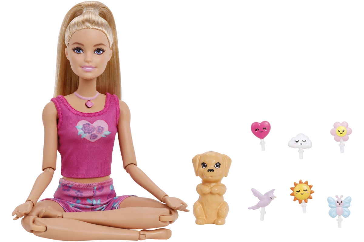Tato meditační panenka Barbie® pomáhá dětem uvolnit se a odpočinout si díky jemnému světlu a uklidňujícím zvukům inspirovaným přírodou. Když panenka sedí nebo stojí, stačí stisknout náhrdelník a spustí se meditační zvuky pro pohybovou, aktivní meditaci. Při poloze vleže přehraje zvuky určené k odpočinkové meditaci. Součástí sady je také štěňátko s výměnnými ikonami nálady pro zapojení do hry. Panenka neumí samostatně stát. Barvy a vzhled výrobku se mohou lišit. Věk 3+