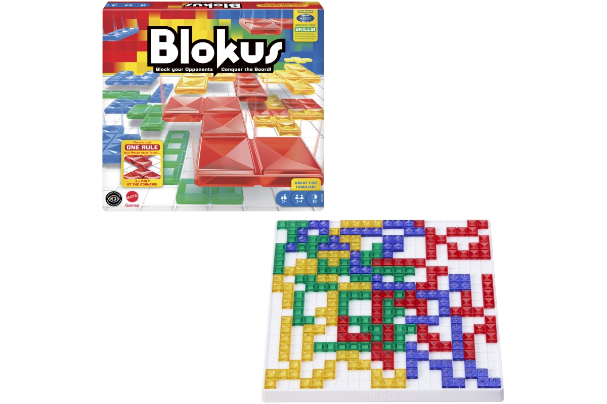 Pravidla strategické hry Blokus™ se naučíte za méně než minutu, ale čeká vás nekonečné množství výzev a zábavy pro celou rodinu. Každý hráč má 21 dílků své barvy a střídavě je pokládá na herní plán. Jediným pravidlem je, že se každý nový dílek musí dotýkat jiného stejné barvy – ale pouze rohem! Cílem je umístit co nejvíce dílků. Hra končí, když už není kam hrát, a vítězí ten, komu zbývá nejméně nepoužitých dílků. Barvy a vzhled karet se mohou lišit. Určeno pro 2-4 hráče. Doporučený věk 7+