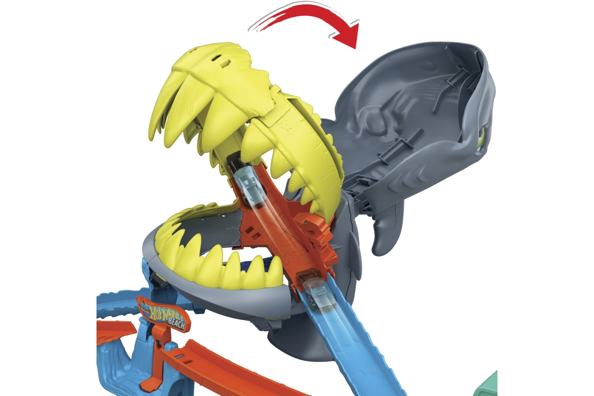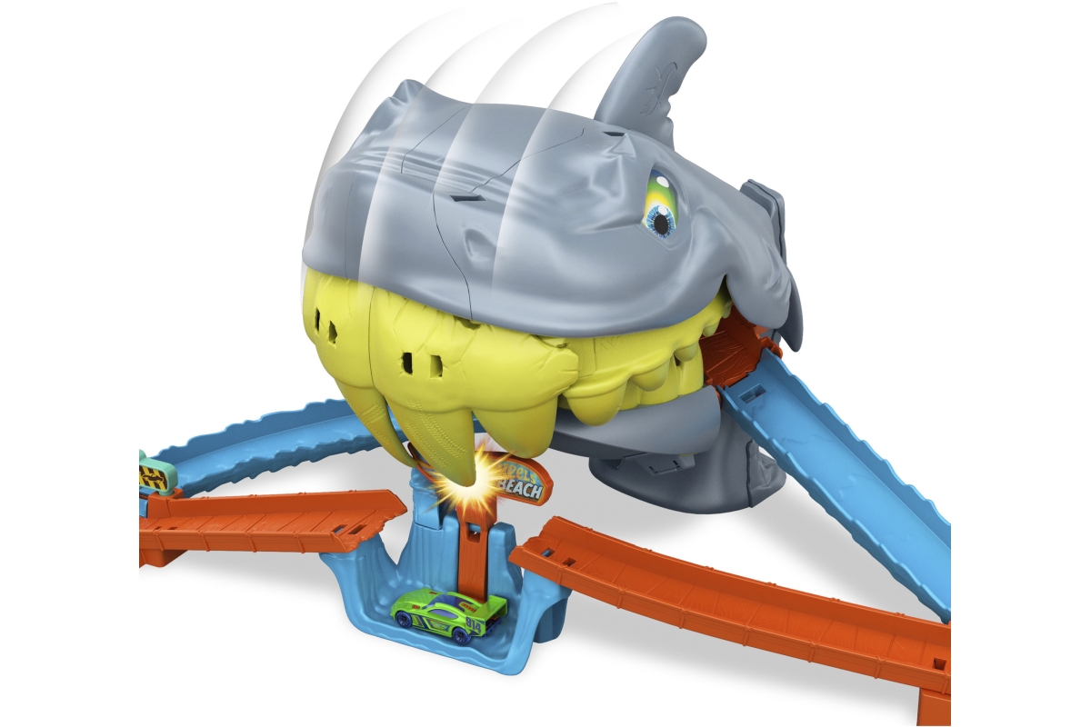 Děti odpálí autíčko vstříc čelistem více než 22 cm dlouhého žraloka a snaží se uniknout dřív, než je pohltí! Akční dráha s motivem pláže nabízí napětí..