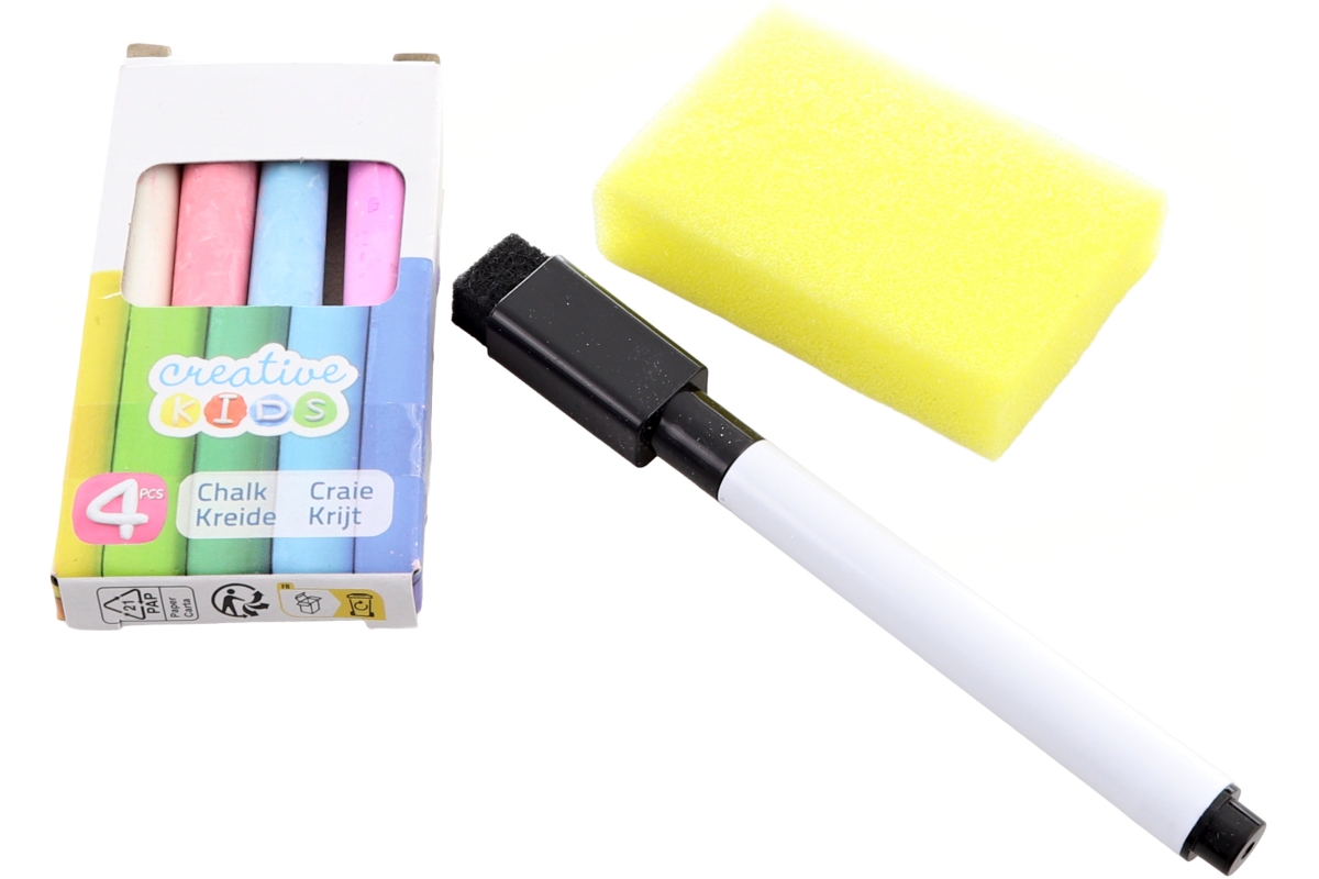 Oboustranná tabule - z jedné strany na křídy, z druhé strany na fix. Materiál dřevo. Balení obsahuje 4 barevné křídy, mazací fixu a houbičku. Rozměry ..