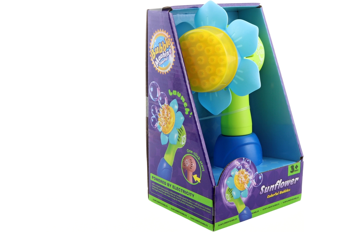 Bublifuk na baterie s motivem slunečnice. Napájení na 3xAAA baterie - nejsou součástí balení. Návod: vložte baterie, nainstalujte náplň, sundejte kryt a zapněte tlačítkem vzadu. Materiál plast. Baleno v otevřené krabici. Rozměry balení 23x14x11,5 cm. Věk 3+