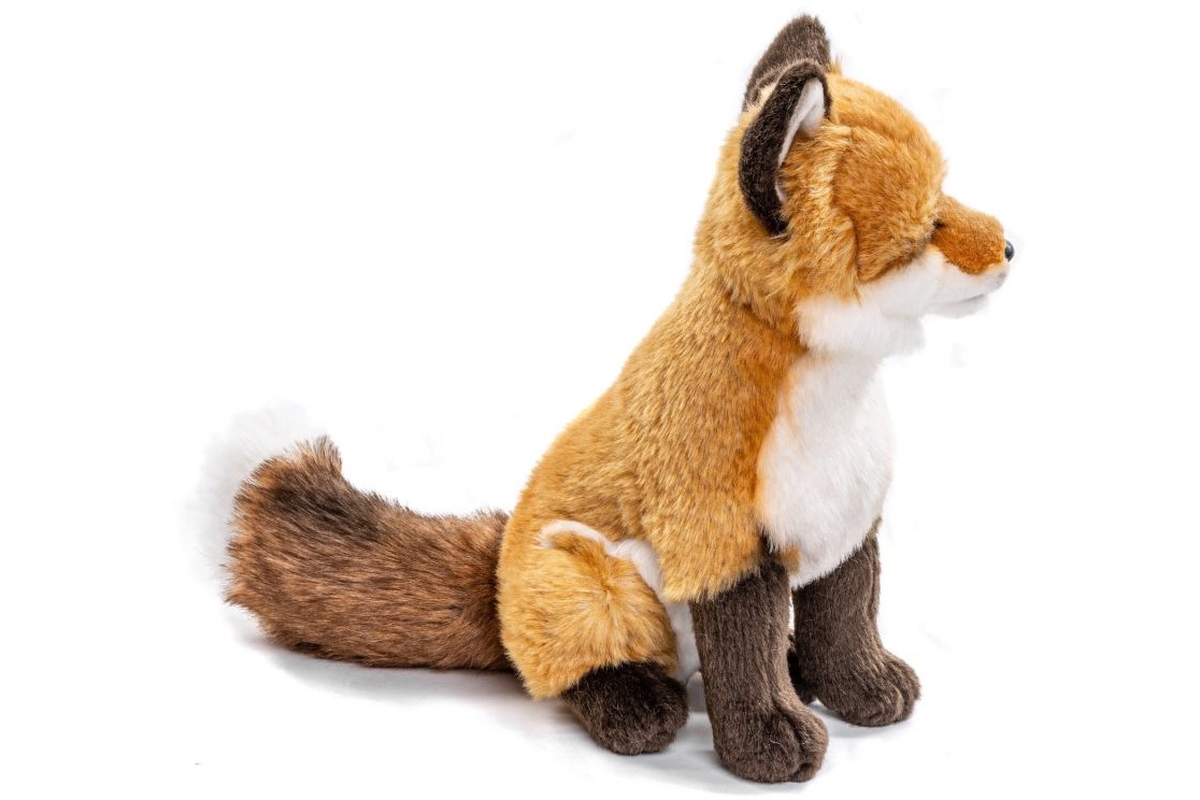 Plyšová liška sedící o rozměrech 27x17x12 cm (plus ocas 14 cm). Věk 0+..