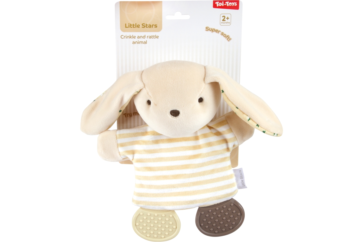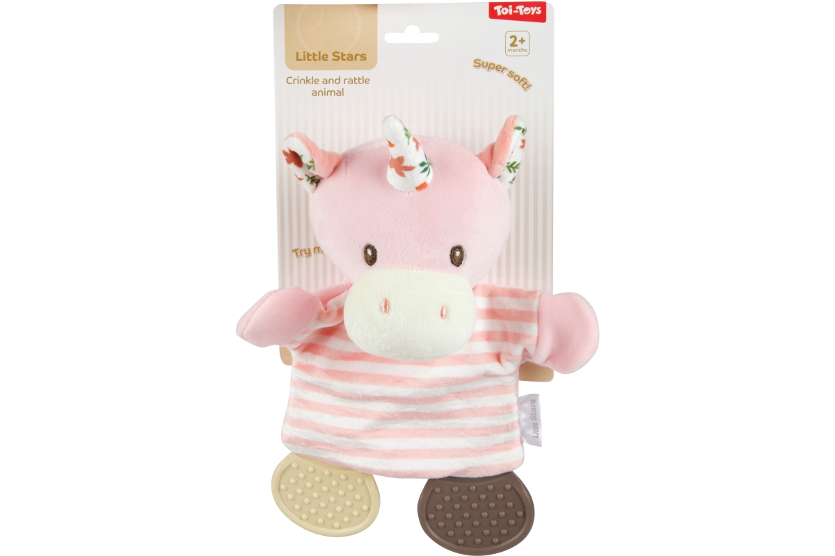 Hračka pro nejmenší děti s motivem zvířátek. Materiál plyš. Tělíčko zvířátka šustí. Baleno na kartě. Rozměry balení 29x18x8 cm. Rozměry hračky 25x18x8..