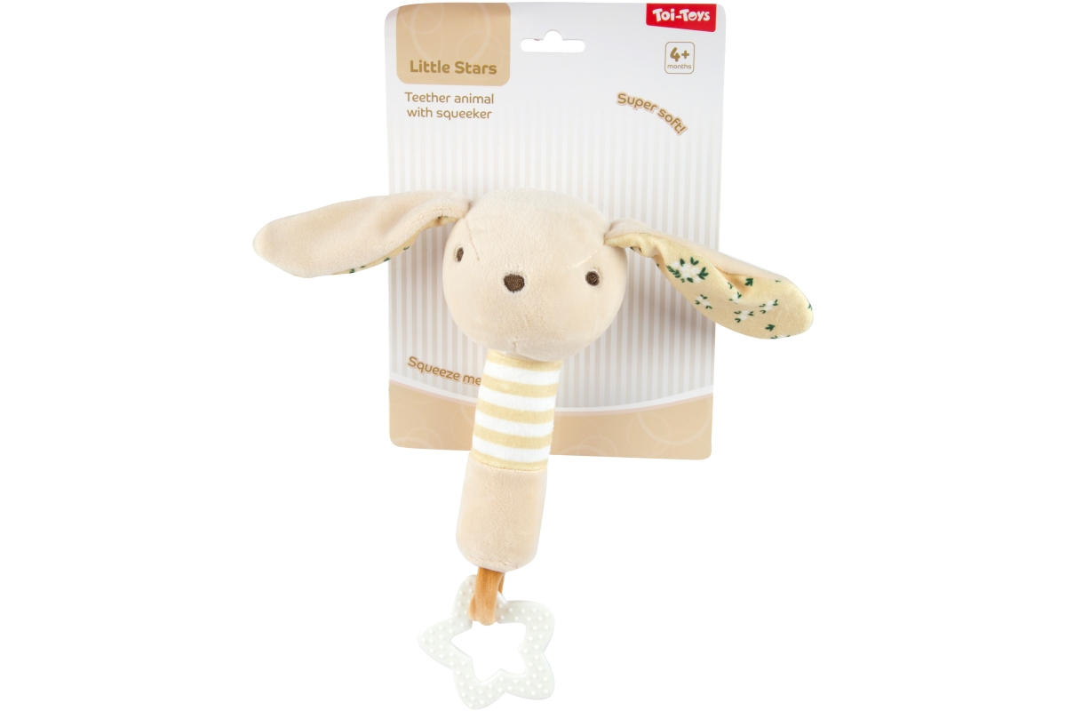 Plyšová hračka pro nejmenší děti s motivem zvířátek v pastelových barvách. Tělíčko zvířátka šustí a na konci se nachází kousátko. 3 druhy - dodáváme dle skladové dostupnosti. Baleno na kartě. Rozměry balení 29x15x8 cm. Rozměry chrastítka 25x8x8 cm. Věk 4m+