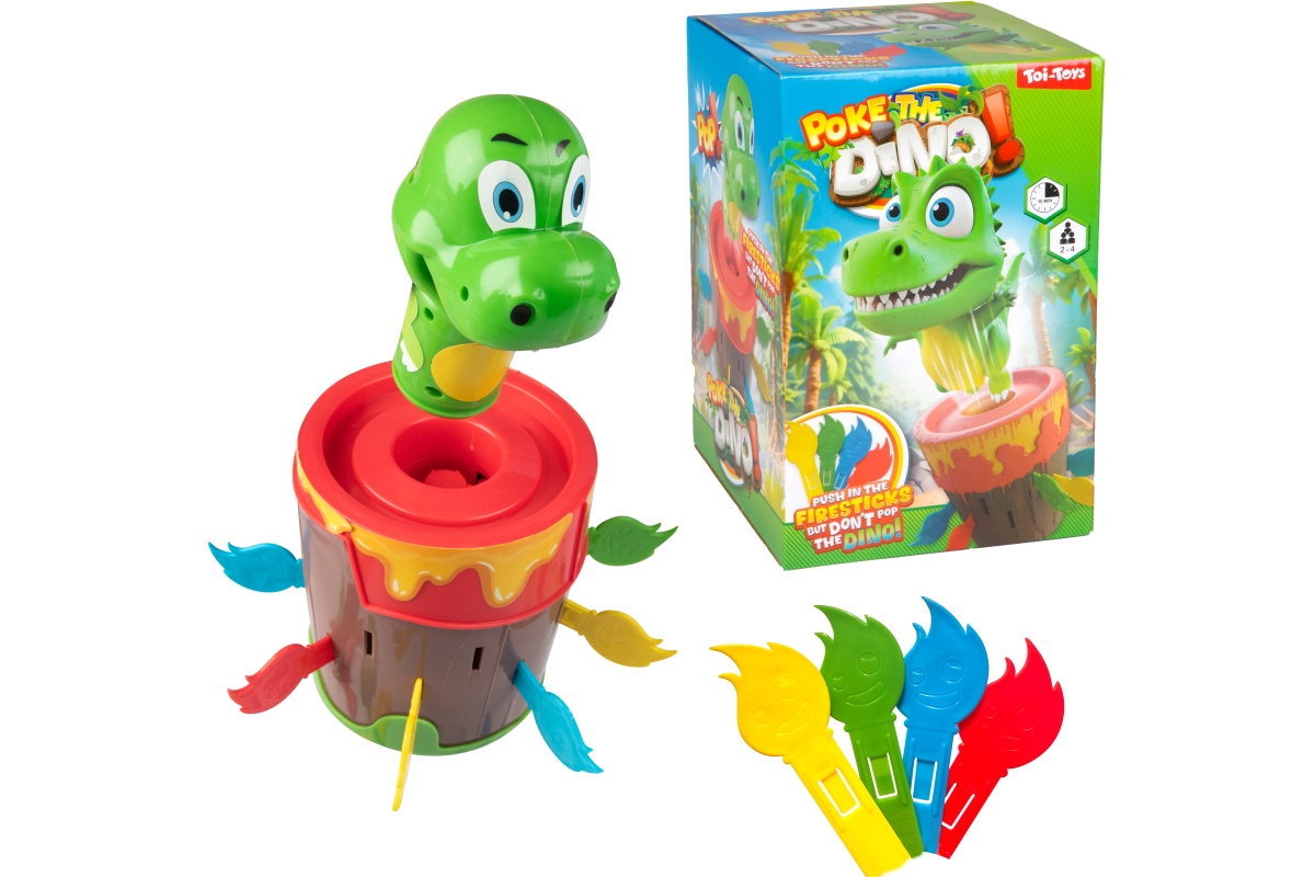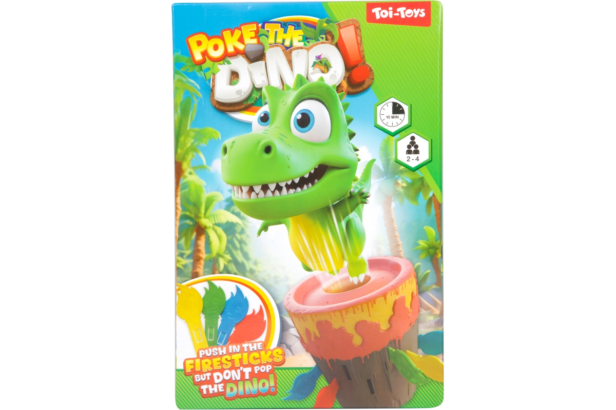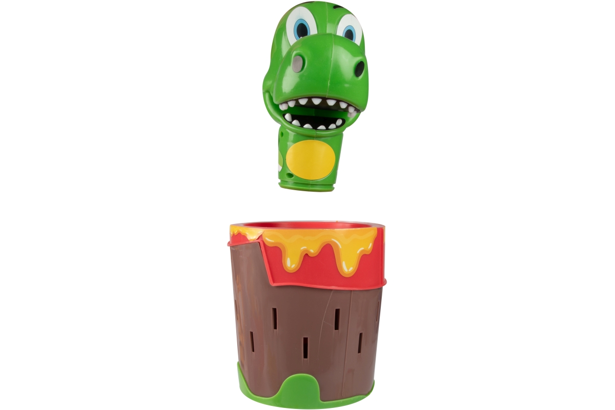 Společenská hra Vyskakující dino. Hráči jednotlivě vkládají ohnivé tyčky do základny a když se dotknou tyčkou draka, drak vylítne a hráč vypadává. Ke hře nejsou třeba baterie. Materiál plast. Balení obsahuje základnu, hlavu dinosaura, 16 tyček a arch se samolepkami. Baleno v krabici. Rozměry balení 19x12x12,5 cm. Určeno pro 2-4 hráče. Doba hry cca 15 minut. Věk 3+