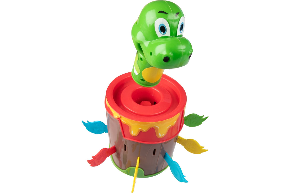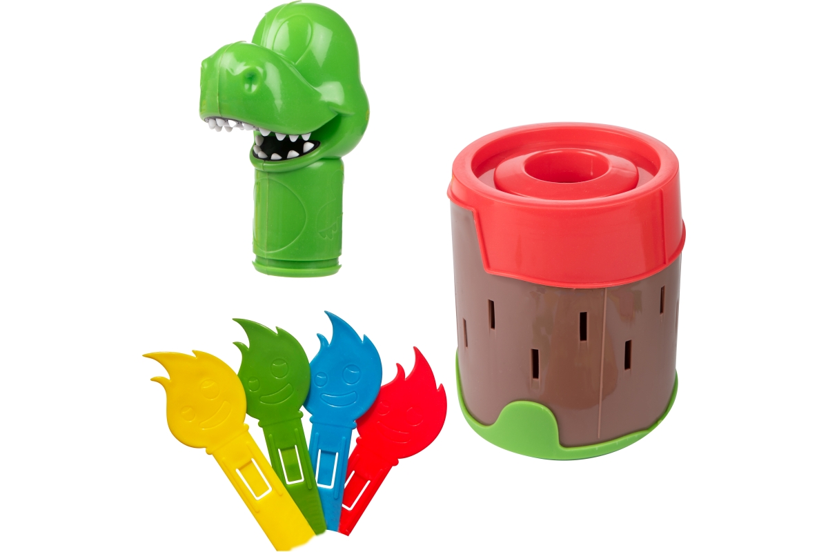 Společenská hra Vyskakující dino. Hráči jednotlivě vkládají ohnivé tyčky do základny a když se dotknou tyčkou draka, drak vylítne a hráč vypadává. Ke ..