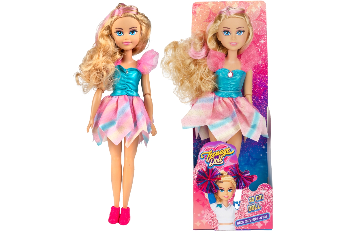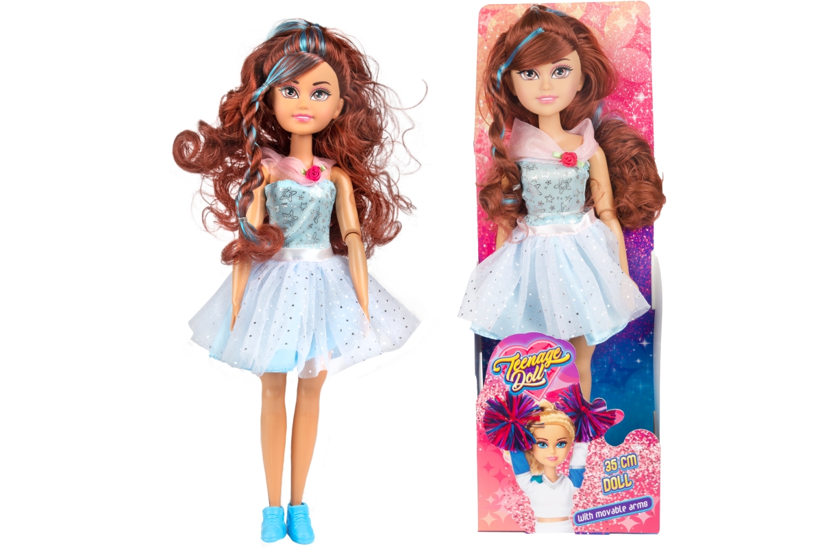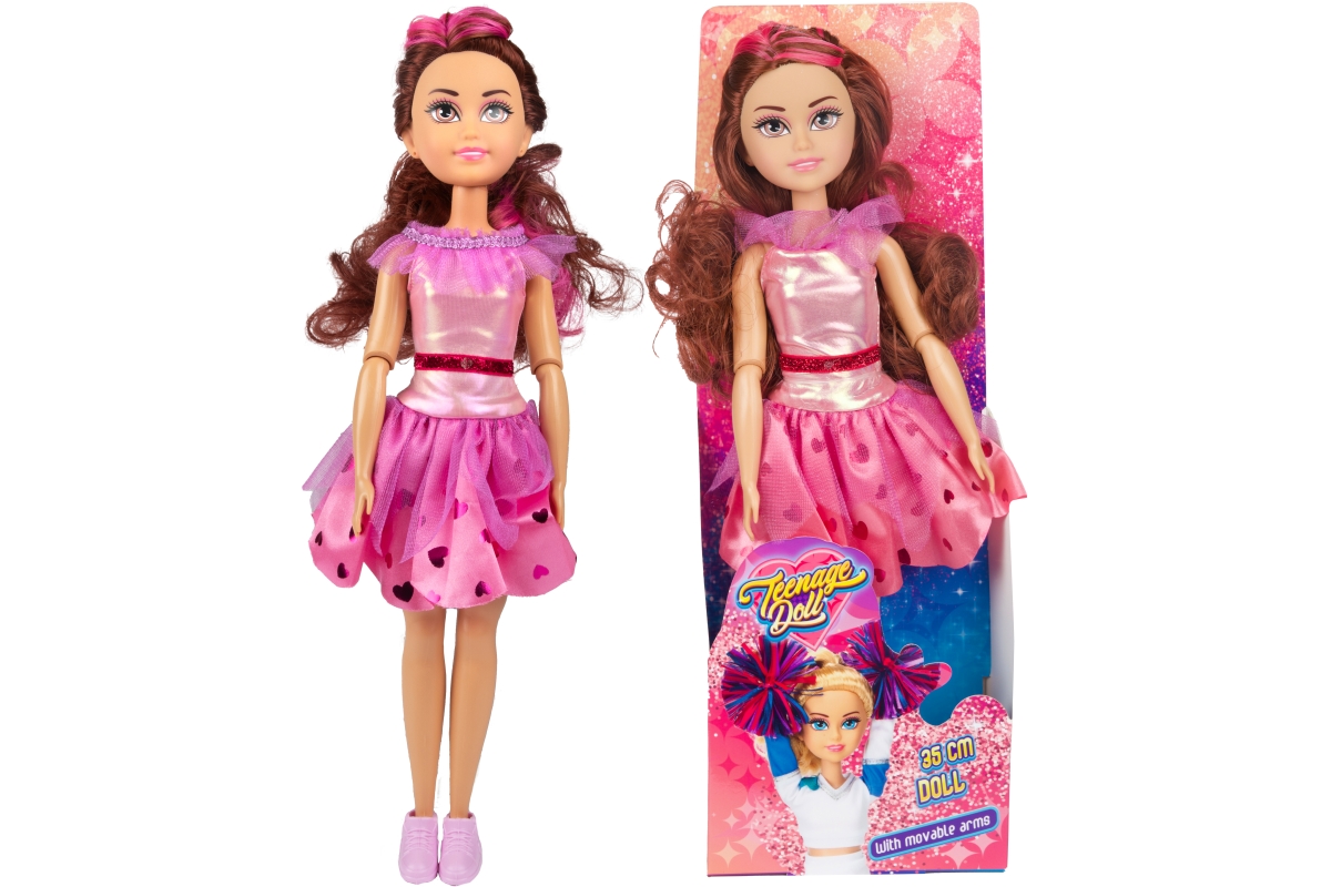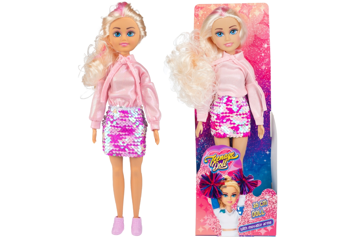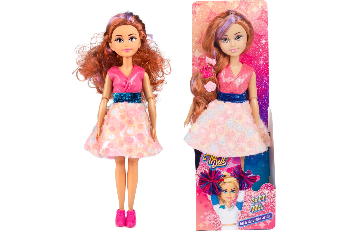 Panenka s delšími vlasy ve stylovém oblečku. Panenka má kloubové ruce. Materiál plast+polyester. Baleno v otevřené krabici. Rozměry balení 38x13x6 cm...