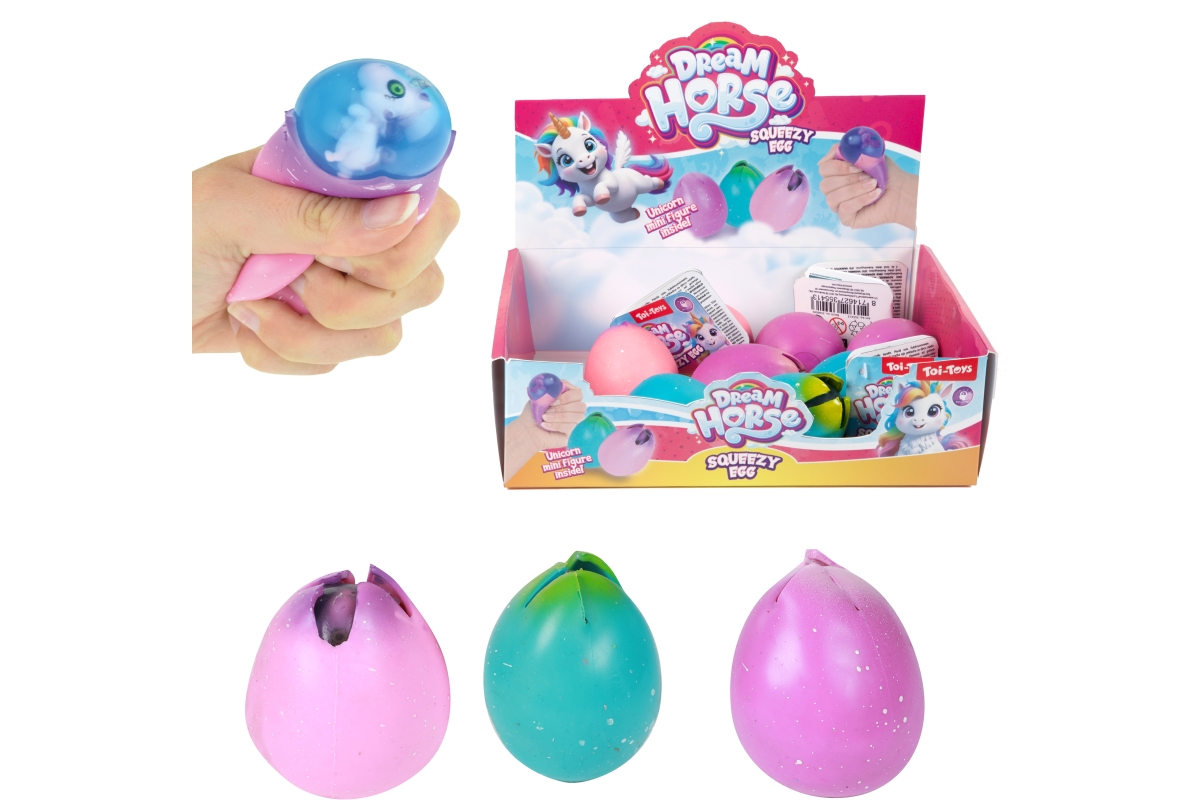 Mačkací vejce s jednorožcem uvnitř. Velikost vejce 6cm, průměr 5 cm. Více druhů - dodáváme dle skladové dostupnosti. Věk 3+..
