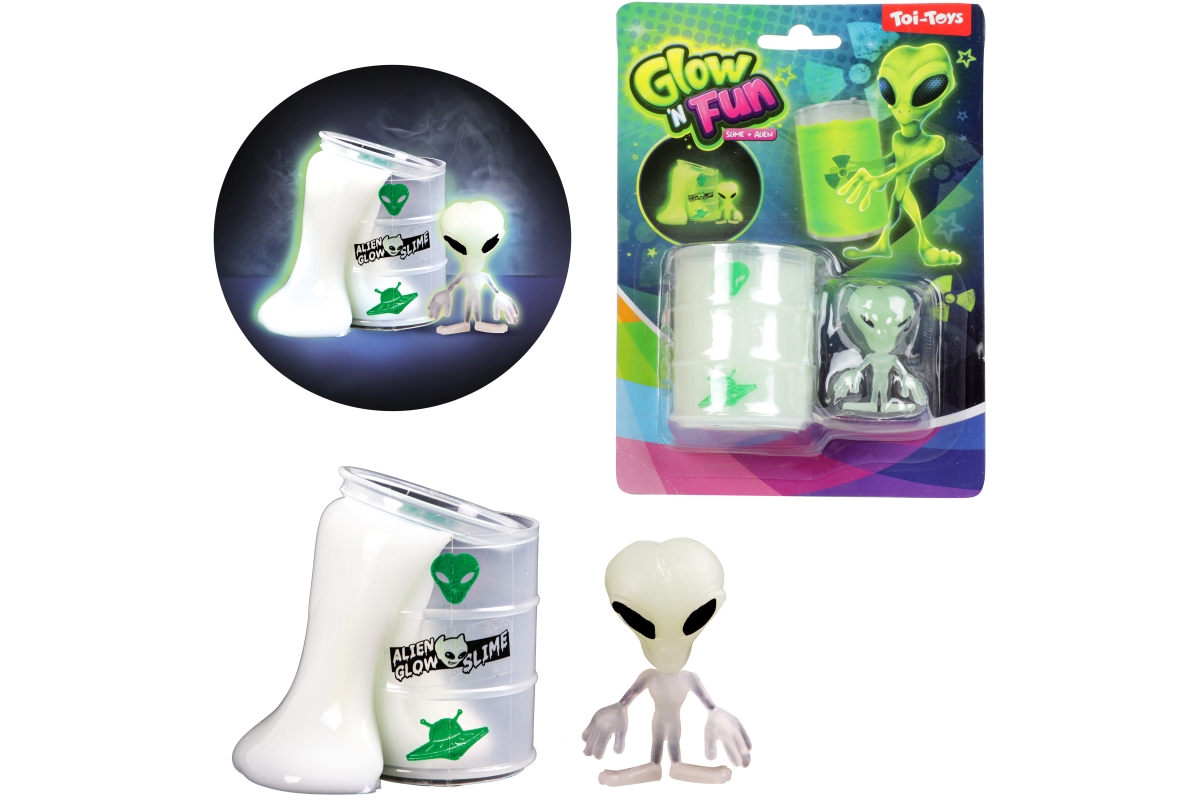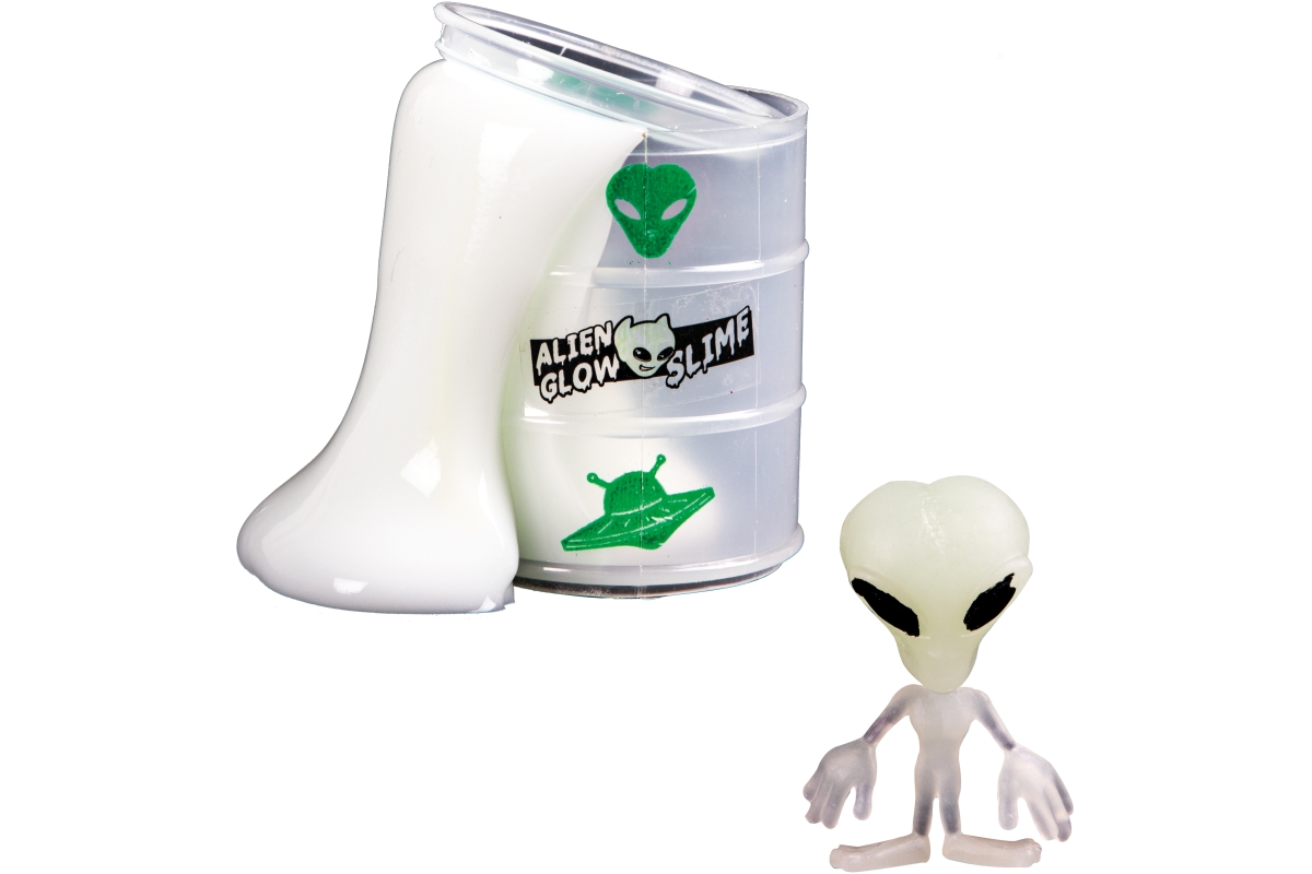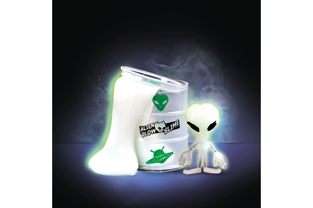 Sliz v barelu s mimozemšťanem. Sliz ve tmě svítí. Baleno na kartě. Rozměry balení 18x12,5x4,5 cm. Materiál obalu plast. Rozměry barelu 6x4,5 cm. 2 dr..