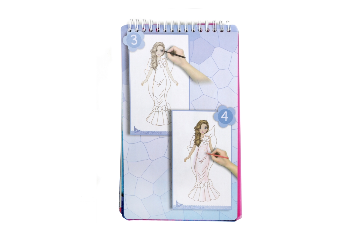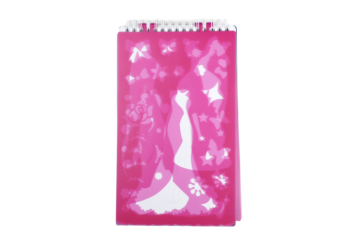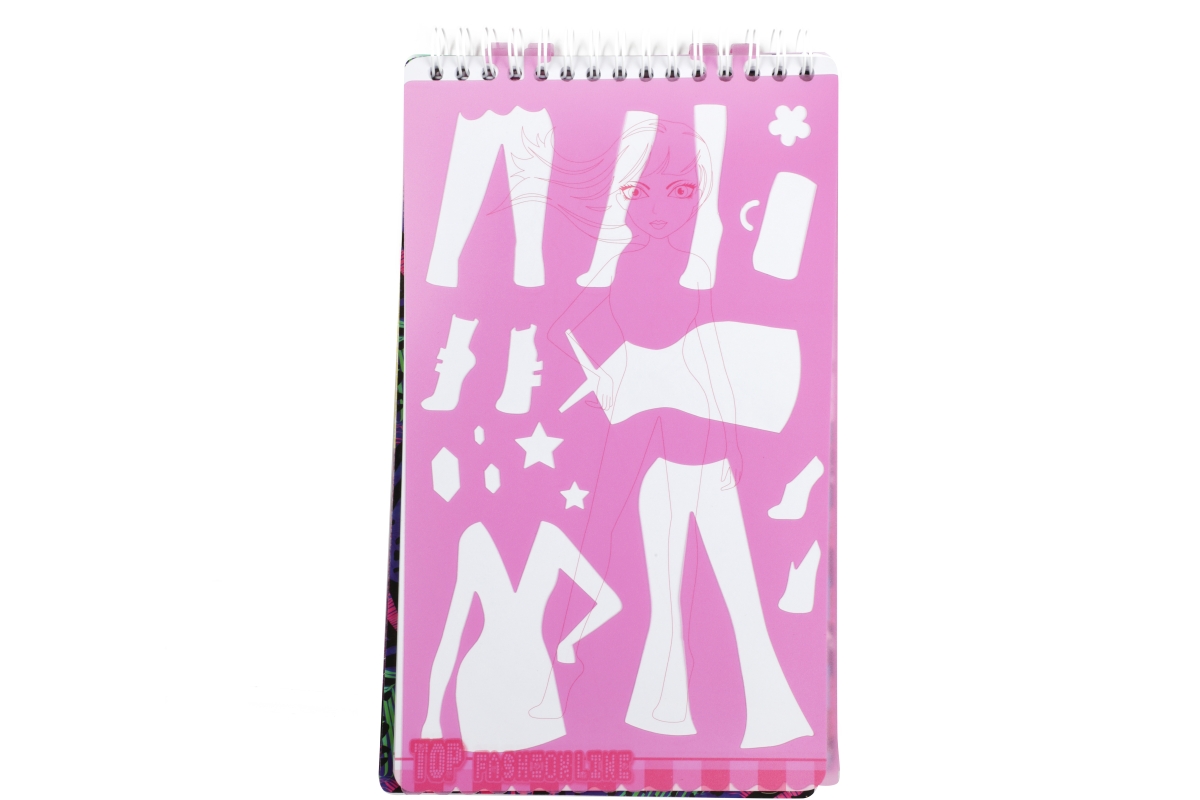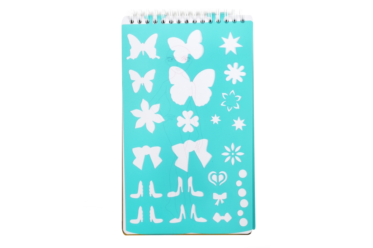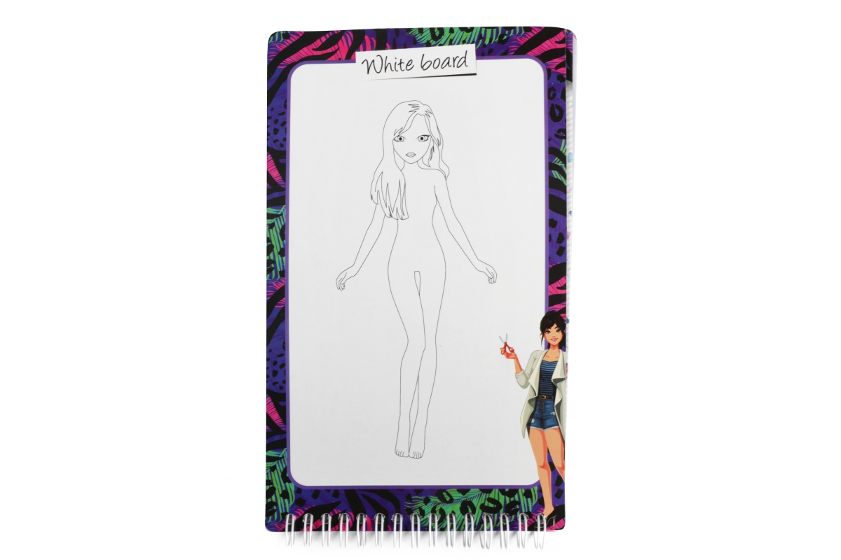 Skicář pro malé návrhářky. Skicář má kroužkovou vazbu a obsahuje 2 mazací strany pro stíratelný fix, 4 archy se šablonami a 30 archů se základní posta..