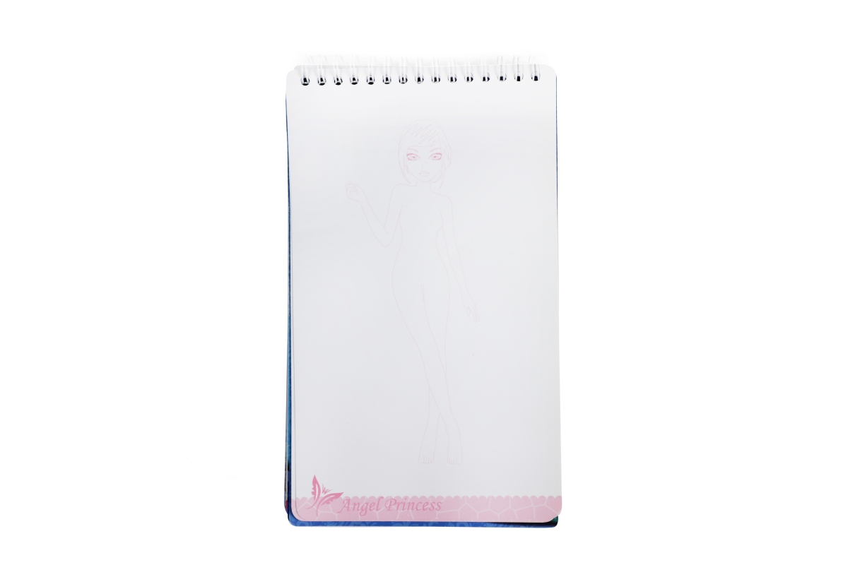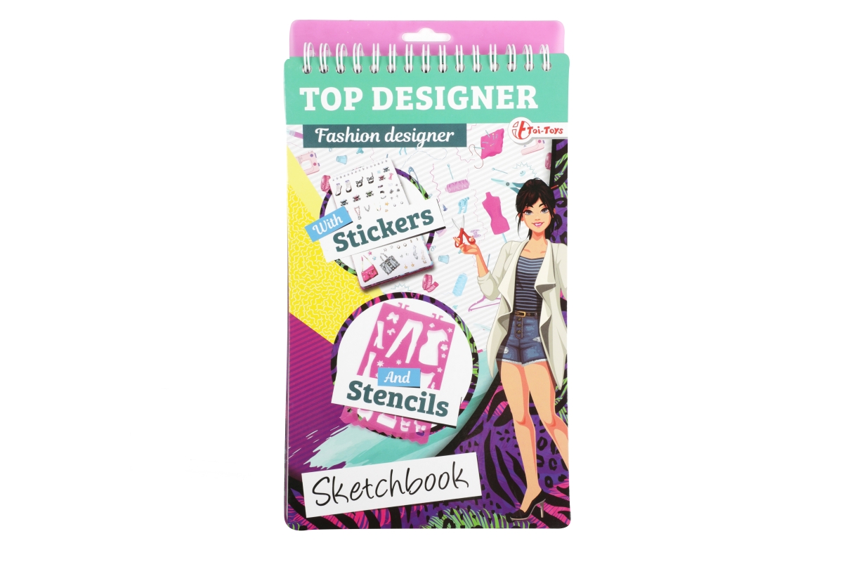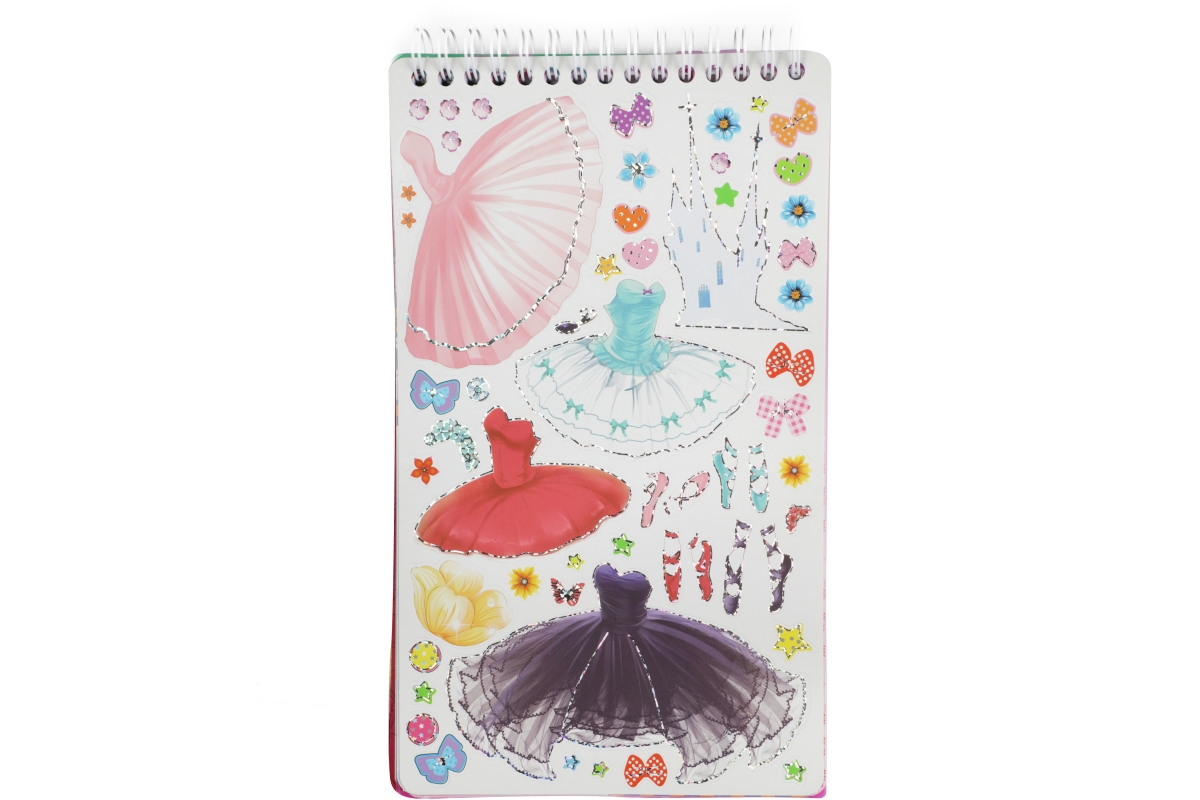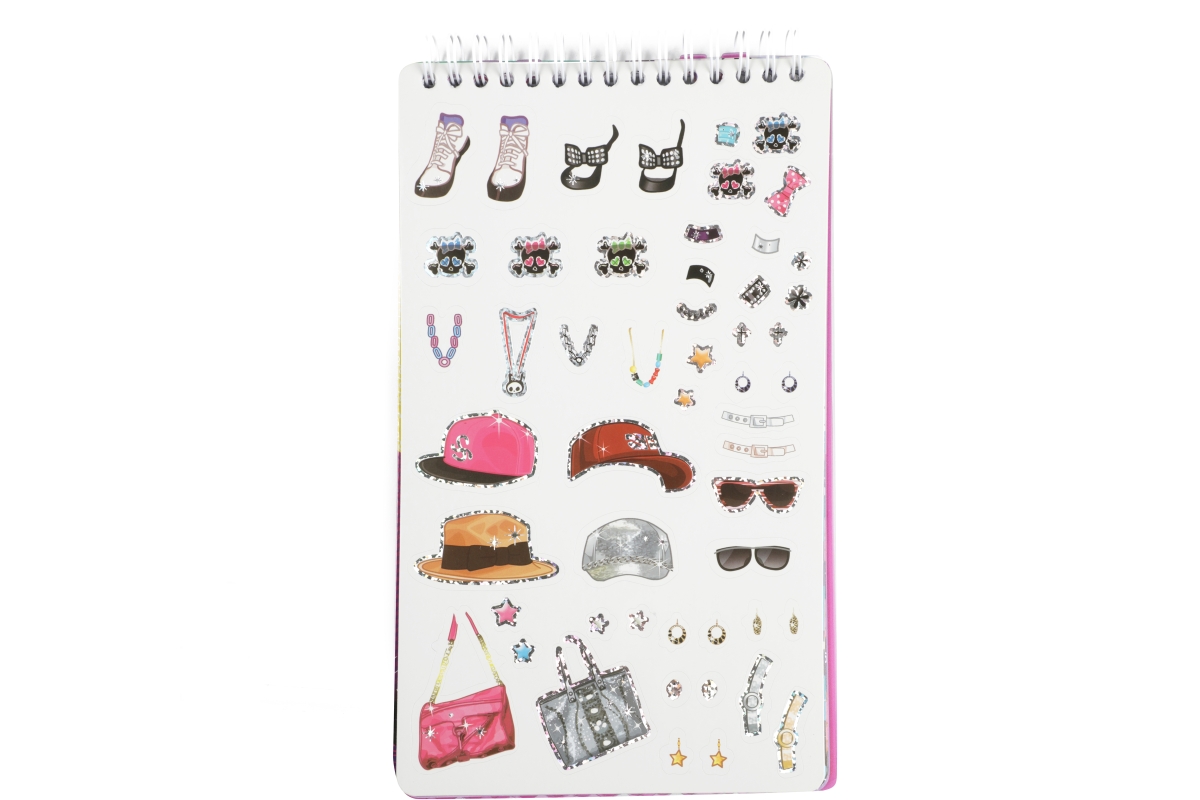Skicář pro malé návrhářky. Skicář má kroužkovou vazbu a obsahuje 2 mazací strany pro stíratelný fix, 4 archy se šablonami a 30 archů se základní posta..