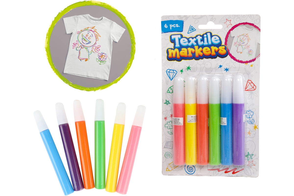 Fixy určené k malování na textil. V balení 6 barev. Baleno na kartě. Rozměry balení 19x11,5x1,5 cm. Věk 3+..