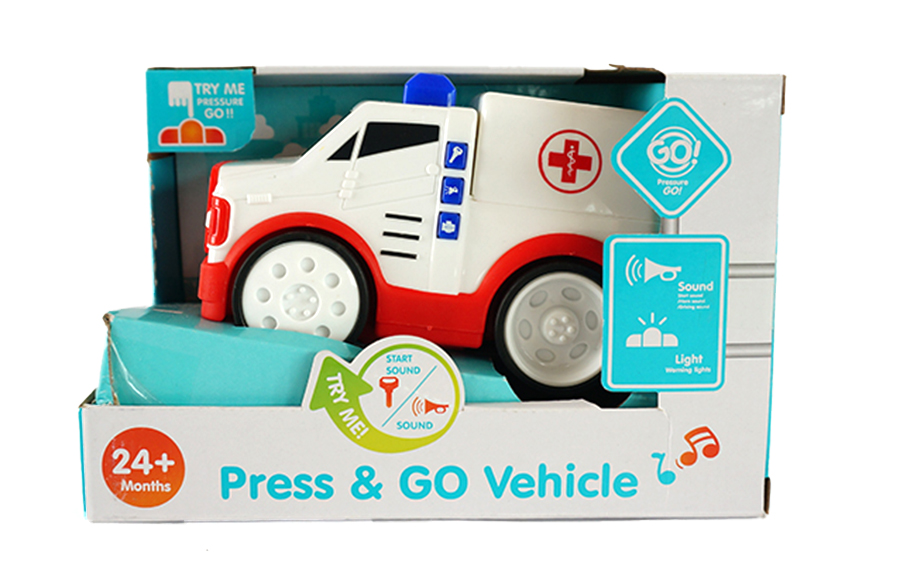 Plastové auto, velikost 15 cm. 3 zvuky, startování, houukání a zvuk motoru. Při stalečení majáku auto jede a maják svítí...