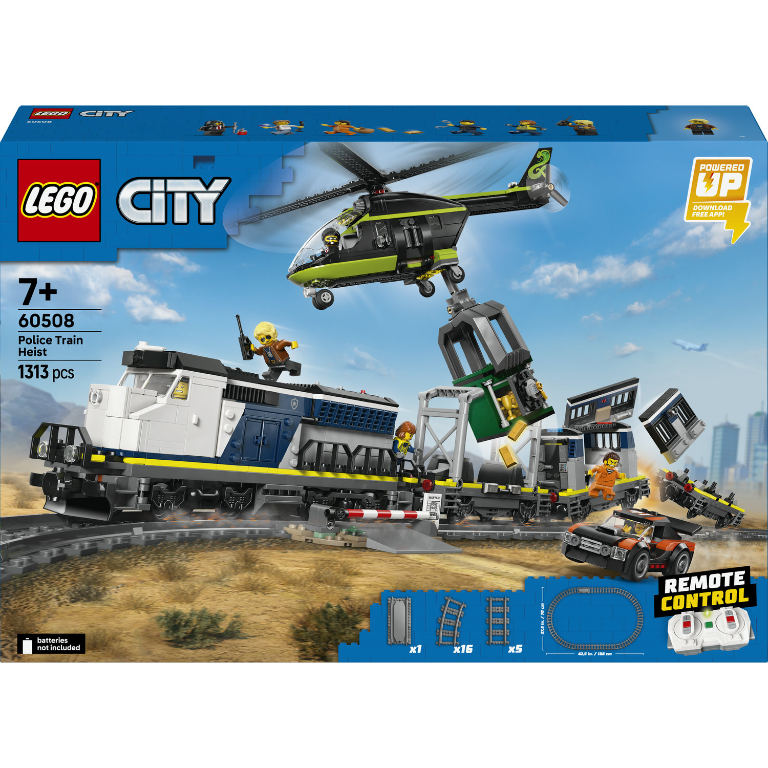 Nastupte do palubu modelu LEGO® City Loupež v policejním vlaku (60508) pro děti od 7 let a zažijte nekonečnou akci. Tato elektrická vlaková souprava s funkcí Powered Up pro děti obsahuje funkční lokomotivu a 3 plošinové vozy, které přepravují vězeňskou celu, bankovní trezor a závodní auto. Stavebnice obsahuje také oválnou železniční trať s přejezdem a kolejnicí pro opětovné nasazení vlaků na koleje. Přidejte model vrtulníku s funkčním drapákem a minifigurky detektiva, policisty, strojvůdce a 3 zločinců, a pusťte se do fantastických dobrodružství plných vlakových loupeží. Tato stavebnice vlaku představuje skvělé překvapení nebo dárek k narozeninám pro děti od 7 let, které milují modely vláčků a stavění z kostek LEGO. Děti můžou tuto stavebnici zkombinovat s dalšími modely z řady LEGO City (prodávají se samostatně) a zažít ještě více dobrodružství. Děti si užijí stavění modelu policejního vlaku LEGO City s intuitivní aplikací LEGO Builder, která jim umožňuje přibližovat a otáčet modelve 3D a ukládat a sledovat postup stavění. Stavebnice obsahuje 1 313 dílků.